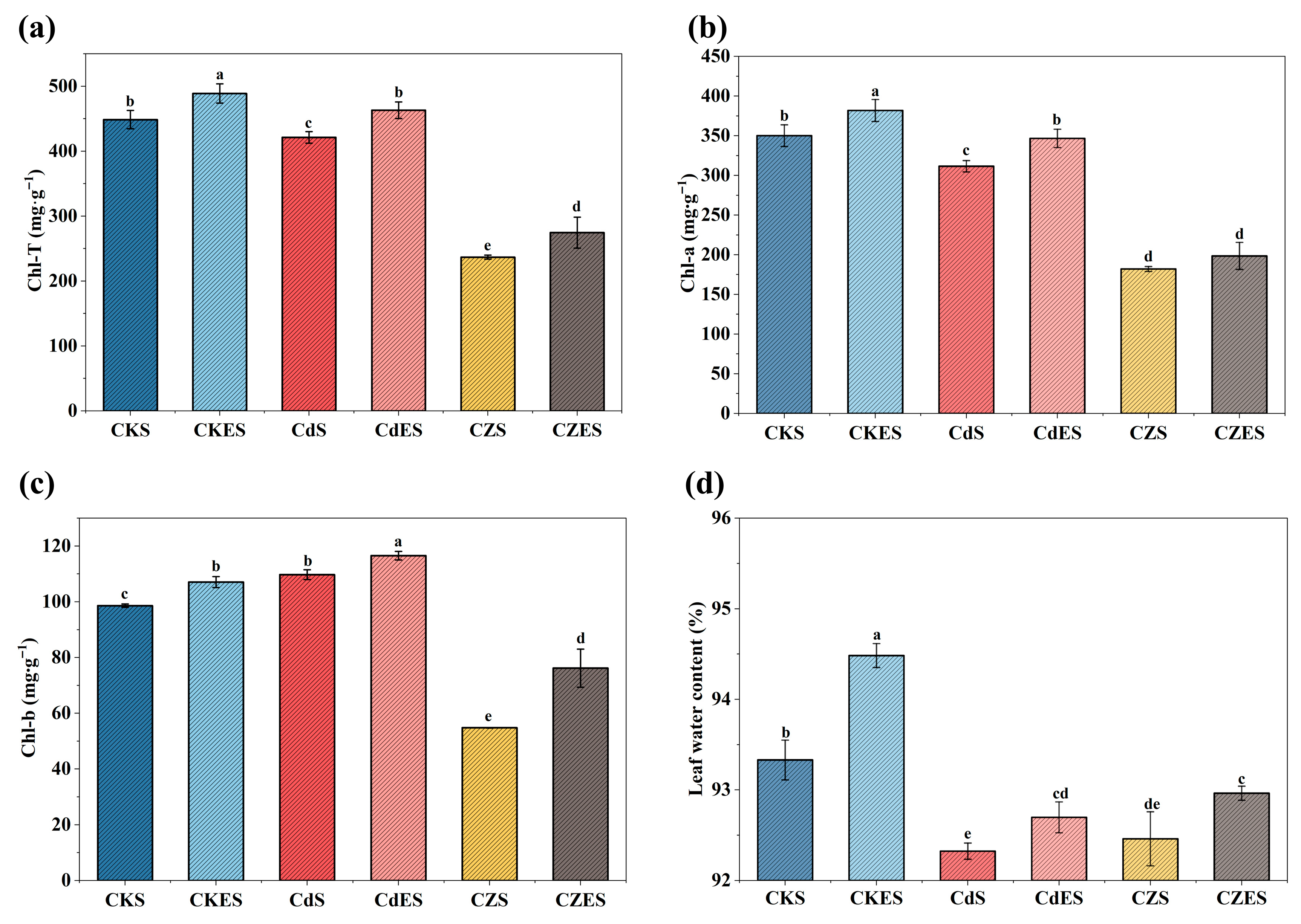 The chlorophyll content in S. lineare was significantly influenced by the type of heavy metal stress. Contrary to the mitigation observed in some growth parameters, Zn addition in combination with Cd (Cd-Zn group) led to a more severe suppression of chlorophyll synthesis compared to Cd stress alone. This was visually evident as exacerbated leaf chlorosis (Figure S1) and quantitatively confirmed by a significant reduction in chlorophyll a, b, and total chlorophyll content by 41.57%, 50.04%, and 43.78%, respectively, relative to the Cd-only treatment (Figure 2a). In contrast, Zn addition significantly inhibited the photosynthetic process. Specifically, the combined Cd-Zn stress further suppressed chlorophyll synthesis compared to Cd stress alone, resulting in more severe leaf chlorosis (Figure S1). The contents of chlorophyll a, b, and total chlorophyll content in the co-contamination group were further reduced by 41.58%, 50.04% and 43.78%, respectively, relative to the Cd-only treatment (Figure 2a–c).
