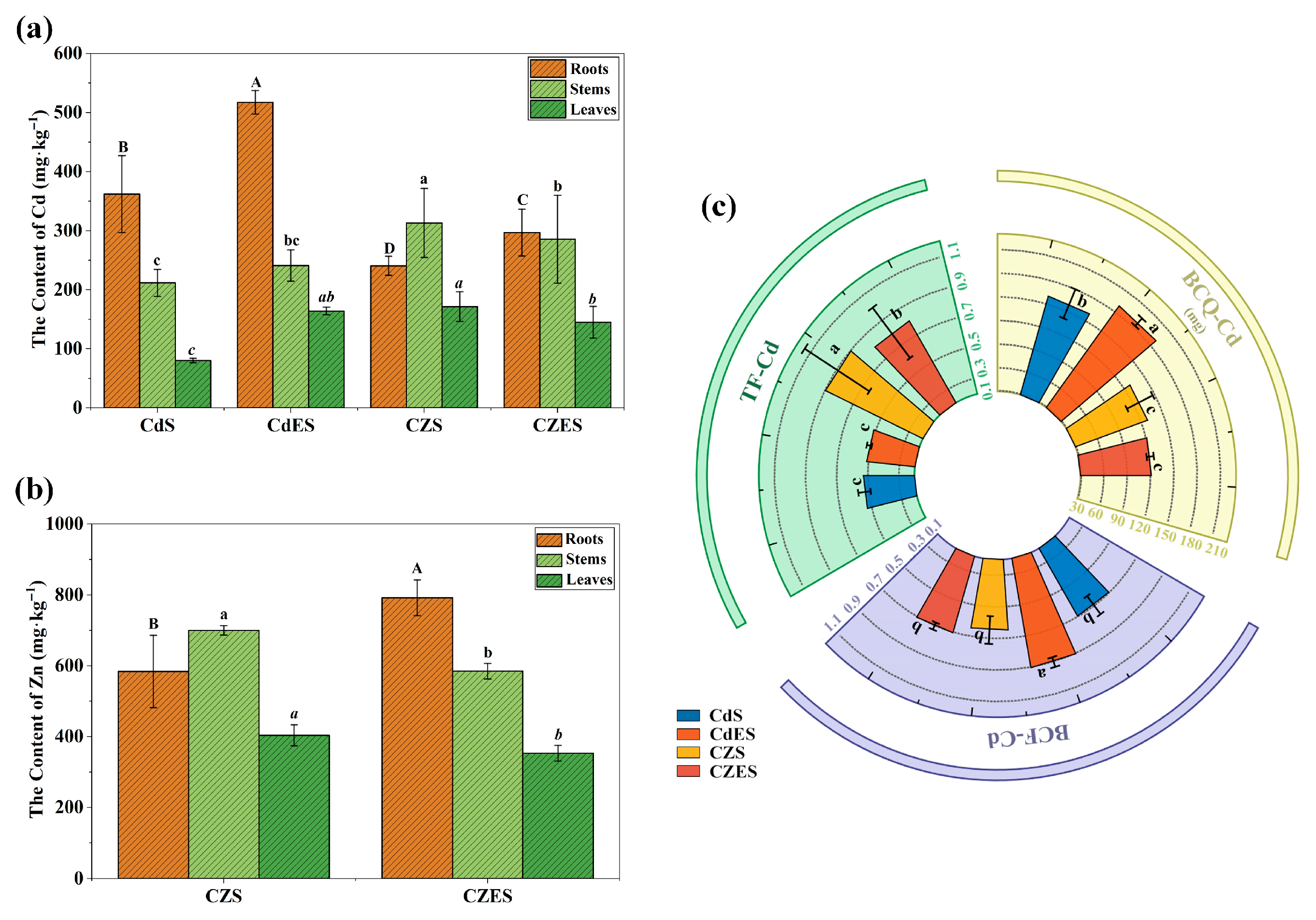 Figure 4. Accumulation and translocation of Cd and Zn in S. lineare. (a) Cd content; (b) Zn content; (c) BCF, BCQ and TF of Cd under different treatments. The above mean (±SD) was calculated from three replications. Different letters indicate significant differences (p < 0.05) among treatments within each tissue: uppercase for roots, lowercase for stems, and italic lowercase for leaves.
