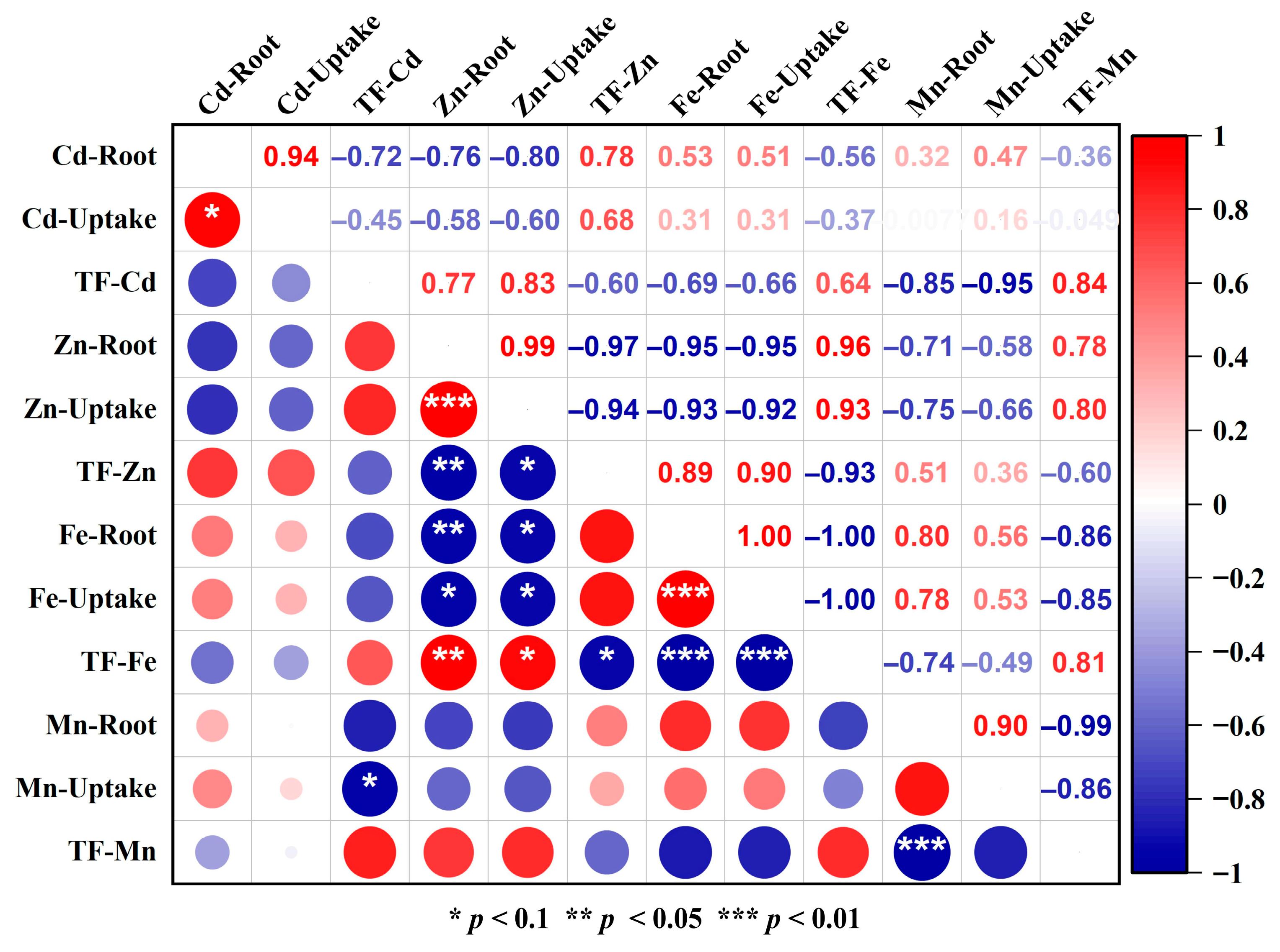 In terms of translocation, Cd stress markedly inhibited the upward transport of both Fe and Mn to shoots. The TF-Fe decreased from 0.34 in CKS to 0.20 in CdS (a 41.18% reduction), while TF-Mn declined by 62.96% (Figure 5c). Notably, Zn addition alleviated the Cd-induced inhibition of Fe translocation, as TF-Fe in the CZS group recovered to a level comparable to the control. A similar alleviating trend was observed for Mn translocation under co-contamination. Furthermore, a strong negative correlation was observed between TF-Cd and root Mn uptake (r = −0.95, Figure 6), suggesting that Mn accumulation in roots might impede the upward transport of Cd.