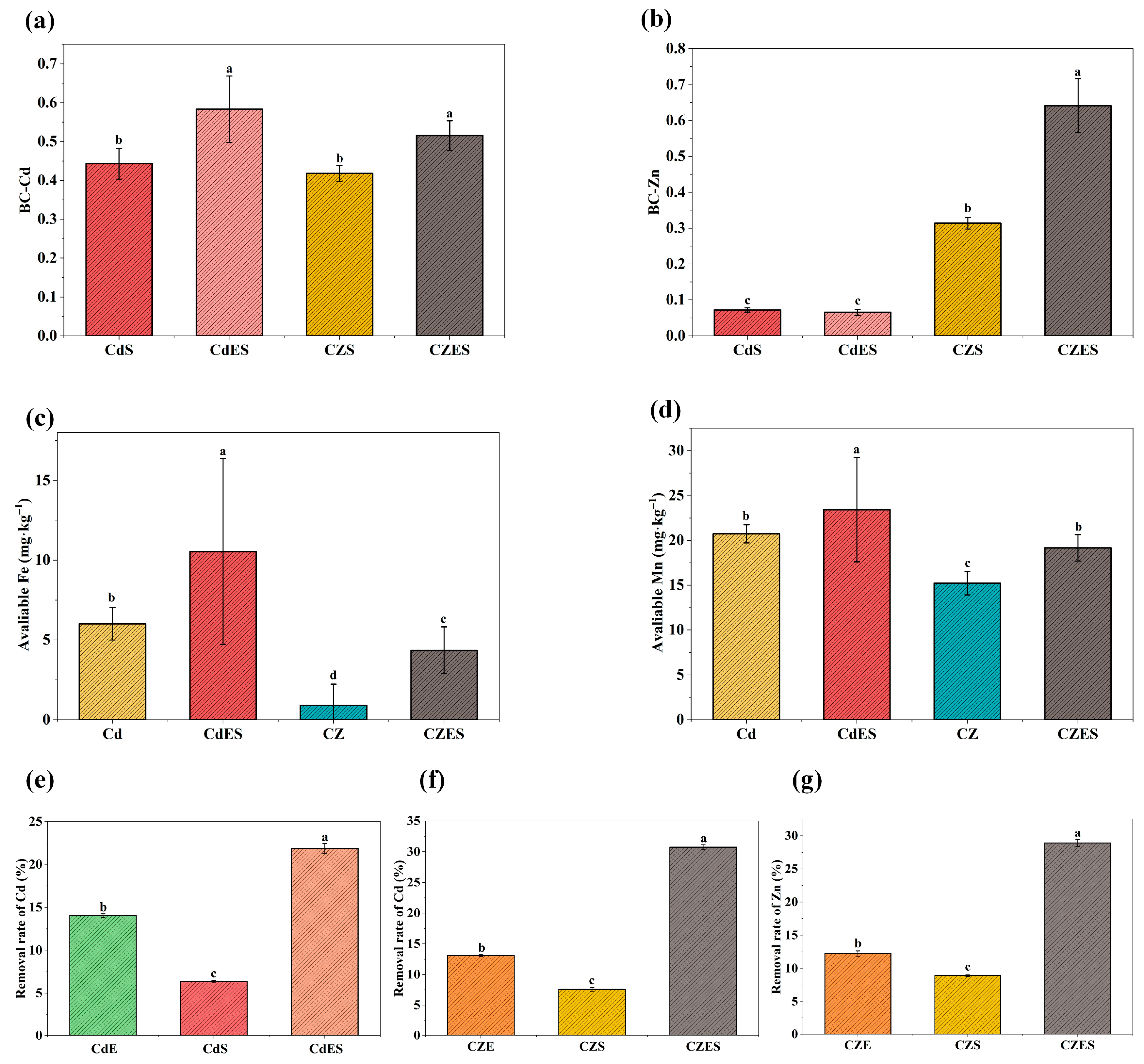 Figure 7. Remediation efficiency in contaminated soil. (a) BC-Cd; (b) BC-Zn. (c) Available Fe; (d) Available Mn; (e) Cd removal rate under Cd stress; (f) Cd removal rate under Cd-Zn co-stress; (g) Zn removal rate under Cd-Zn co-stress; The above mean (±SD) was calculated from three replications. Different letters indicate statistically significant differences at p < 0.05.