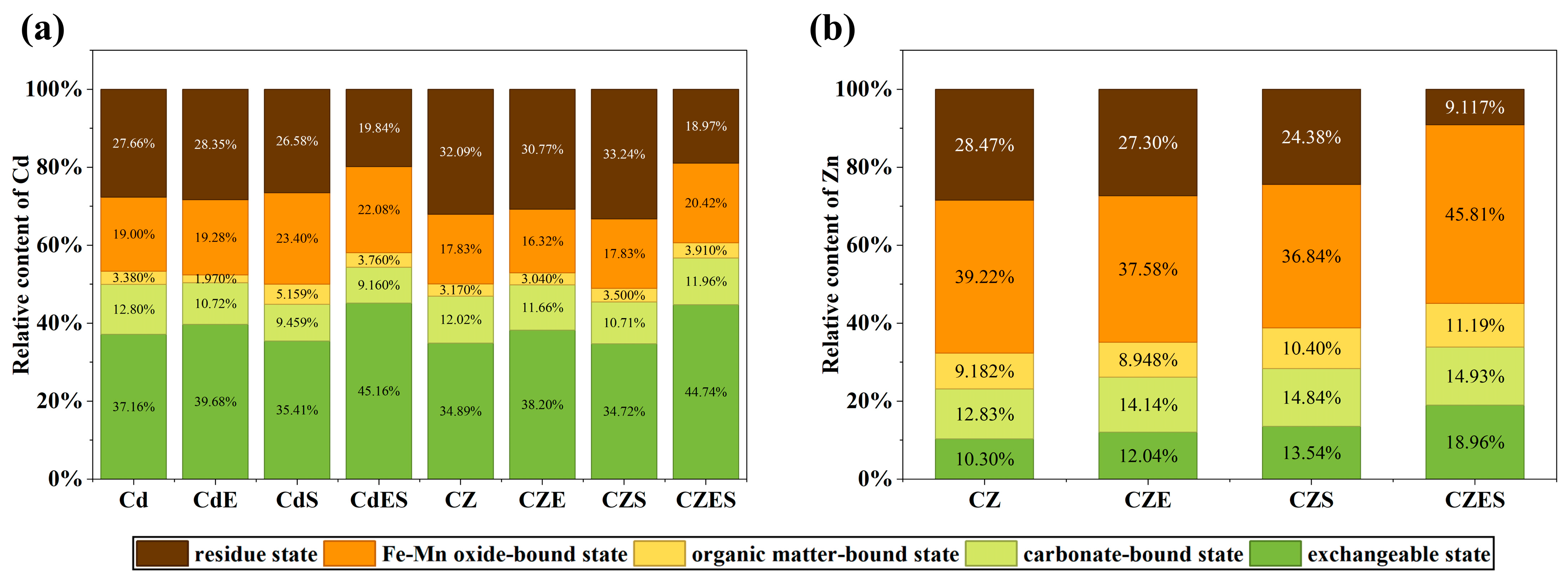 For Zn (Figure 8b), the organically-bound fraction was dominant (~40%). The combined treatment also enhanced Zn mobilization, with the CZES group exhibiting the highest proportions of exchangeable and carbonate-bound Zn and the lowest residual fraction. Notably, the combined treatment significantly increased the organically-bound Zn fraction in the CZES group (45.81%), suggesting that Zn might be fixed by root-secreted organic substances. While this likely reduces immediate biotoxicity, it might maintain potential long-term bioavailability.