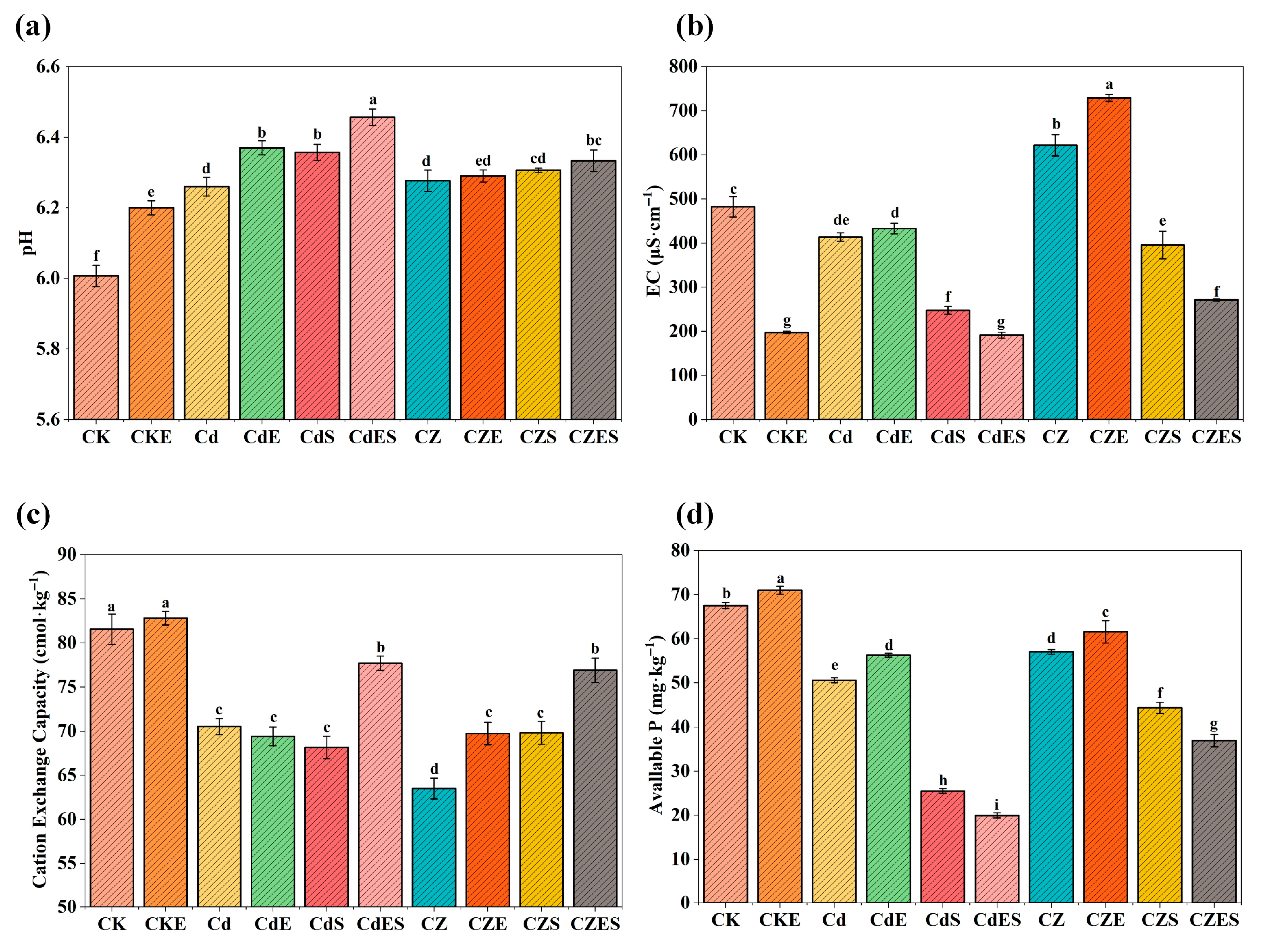 Figure 9. Physicochemical properties of soil under different treatments. (a) pH value; (b) Electrical conductivity (EC); (c) Cation exchange capacity (CEC); (d) Available phosphorus content. The above mean (±SD) was calculated from three replications. Different letters indicate statistically significant differences at p < 0.05.