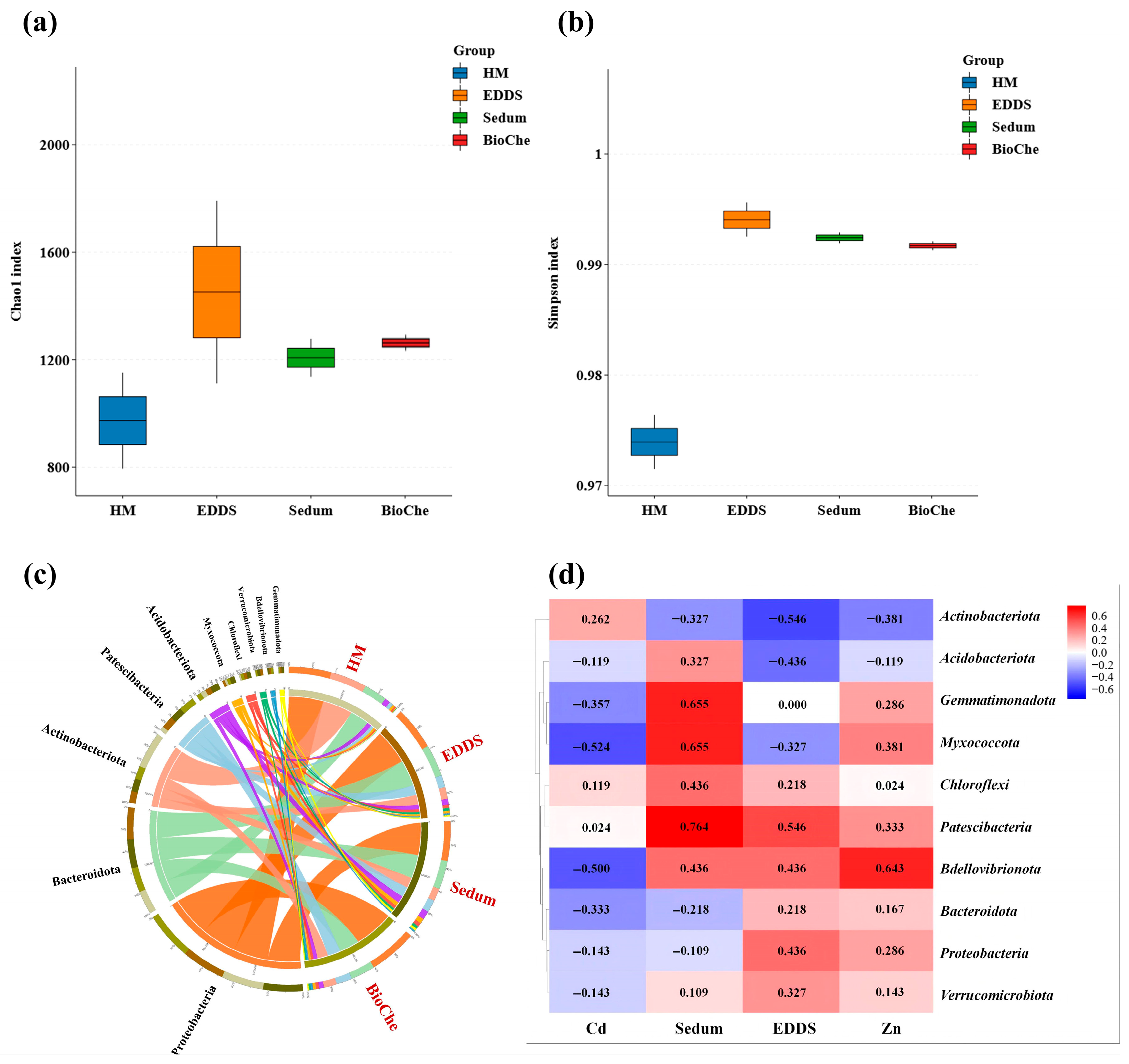Figure 10. Microbial community structure and diversity in soil. (a) Chao1 index; (b) Simpson index; (c) Microbial composition of the top 10 phyla by abundance, to illustrate the differences among the repair methods, we grouped the different samples. “Cd, CZ” are classified as HM, “CdS, CZS” are classified as Sedum, “CdE, CZE” are classified as “EDDS”, “CdES, CZES” are classified as “BioChe”; (d) Heatmap of correlation analysis of microbial enrichment across different treatments.