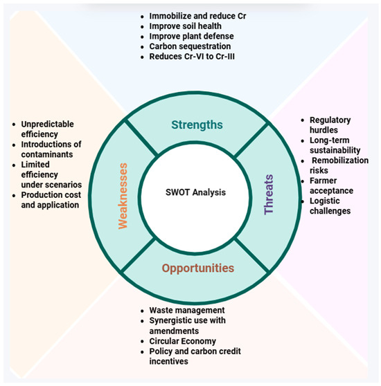 Strengths, weaknesses, opportunities and threats of biochar in remediating Cr-polluted soils and mitigating its toxicity on plants.