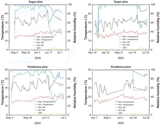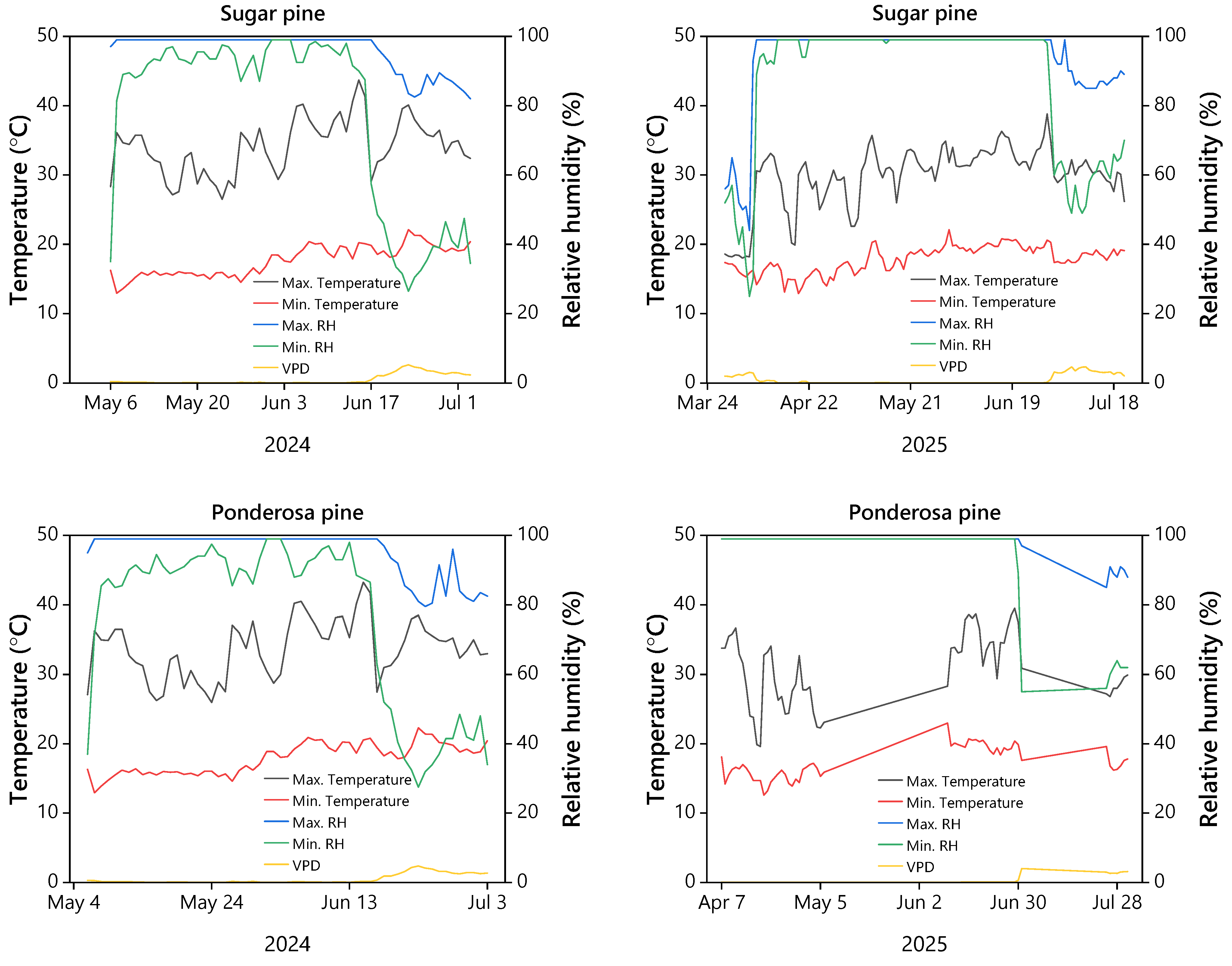 Figure 1. Daily averages of maximum and minimum temperatures, maximum and minimum relative humidity, and vapor pressure deficit (VPD) for sugar pine and ponderosa pine containers across the growing seasons in 2024 and 2025.