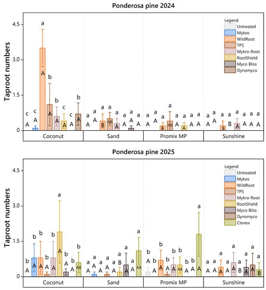 Taproot data followed the same pattern. In coconut coir, the untreated controls for both species clustered in the top statistical tier, performing with equal or greater efficacy than the commercial treatments. In Sunshine, Promix MP, and sand, no significant differences among treatment clusters were detected for either species.