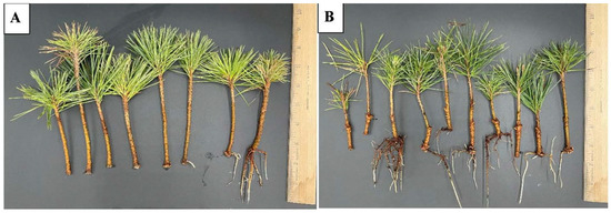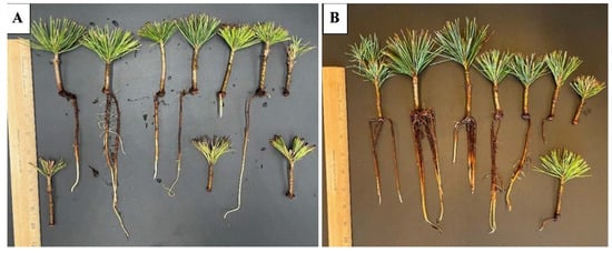 Figure 7. Rooted cuttings of sugar pine at 107 days after transplanting on coconut coir with Mykos (A) and Dynomyco (B) commercial root-promoting treatments in 2024.
