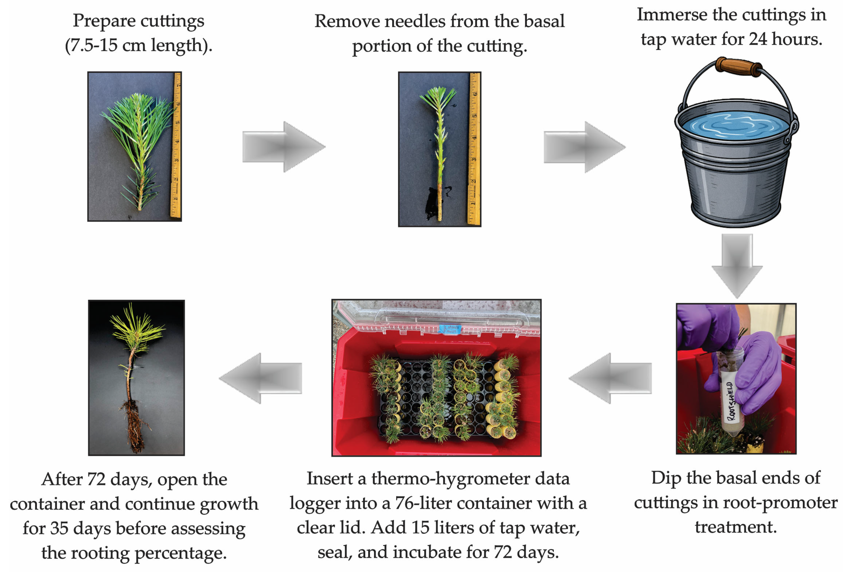 Cuttings (7.5–15 cm) were harvested from 1–2-year-old lignified stems, needles were removed from the lower two-thirds, and cuttings were immersed in tap water for 24 h. For all root-promoting treatments, the basal 3–4 cm of each cutting was immersed directly into the assigned product within 50 mL sterile centrifuge tubes for approximately 5 s. For the 0.31% IBA gel (Clonex) and all powdered or granular commercial mixed microbial/biostimulant products, materials were used undiluted, and no excess material was removed prior to planting.