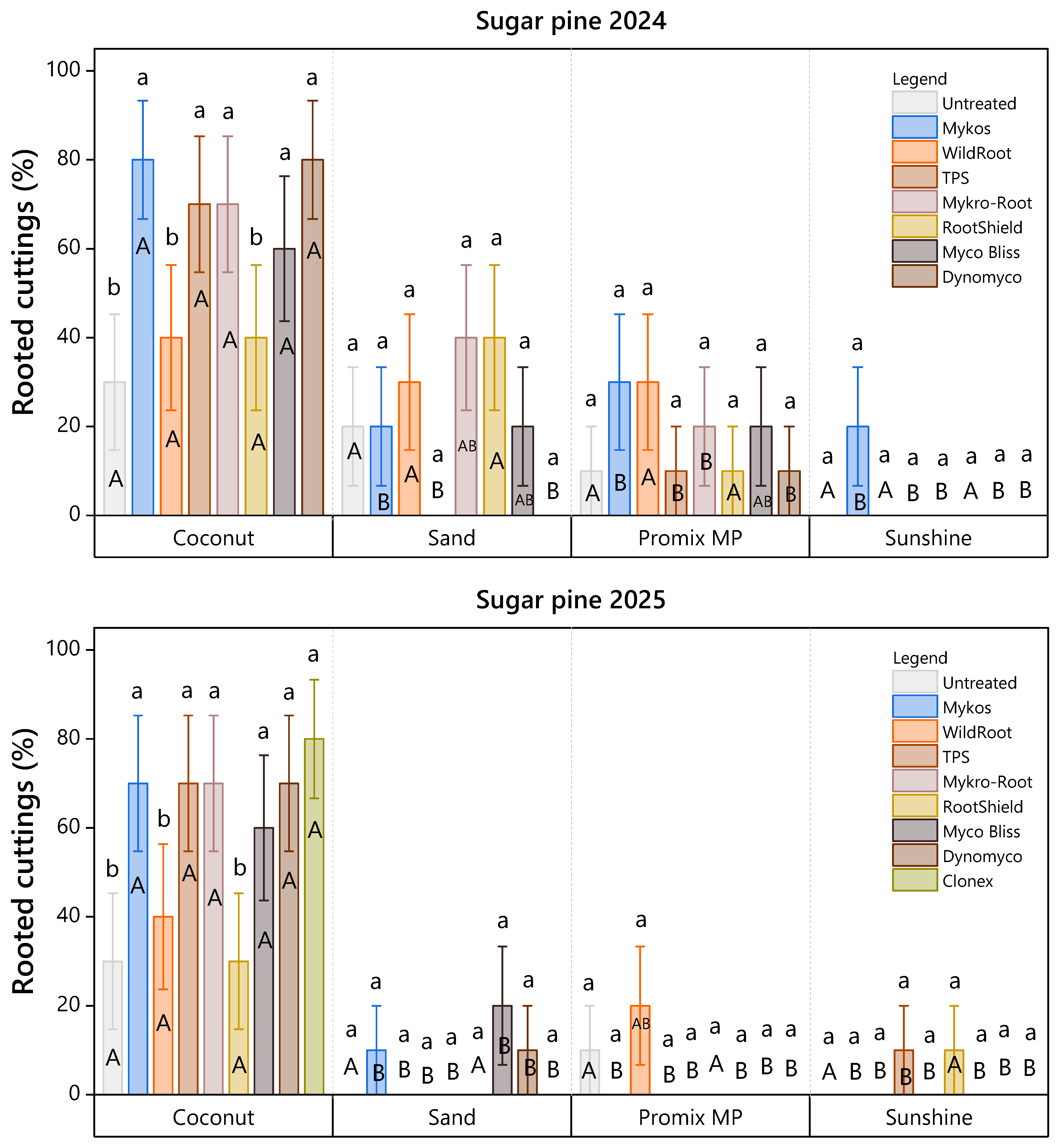 Figure 3. Rooting success of sugar pine cuttings (%) under eight treatments in 2024 and nine treatments in 2025 across four rooting media, assessed 107 days after planting. Lowercase letters indicate significant differences among root-promoting treatments within each medium (Scott-Knott ESD, p < 0.05), while uppercase letters indicate significant differences among rooting media within each root-promoting treatment (Tukey’s HSD, p < 0.05). Bars represent mean rooting percentages ± standard error. Each bar reflects n = 10 containers (experimental units), with 10 cuttings per substrate subplot aggregated to a single value per container.