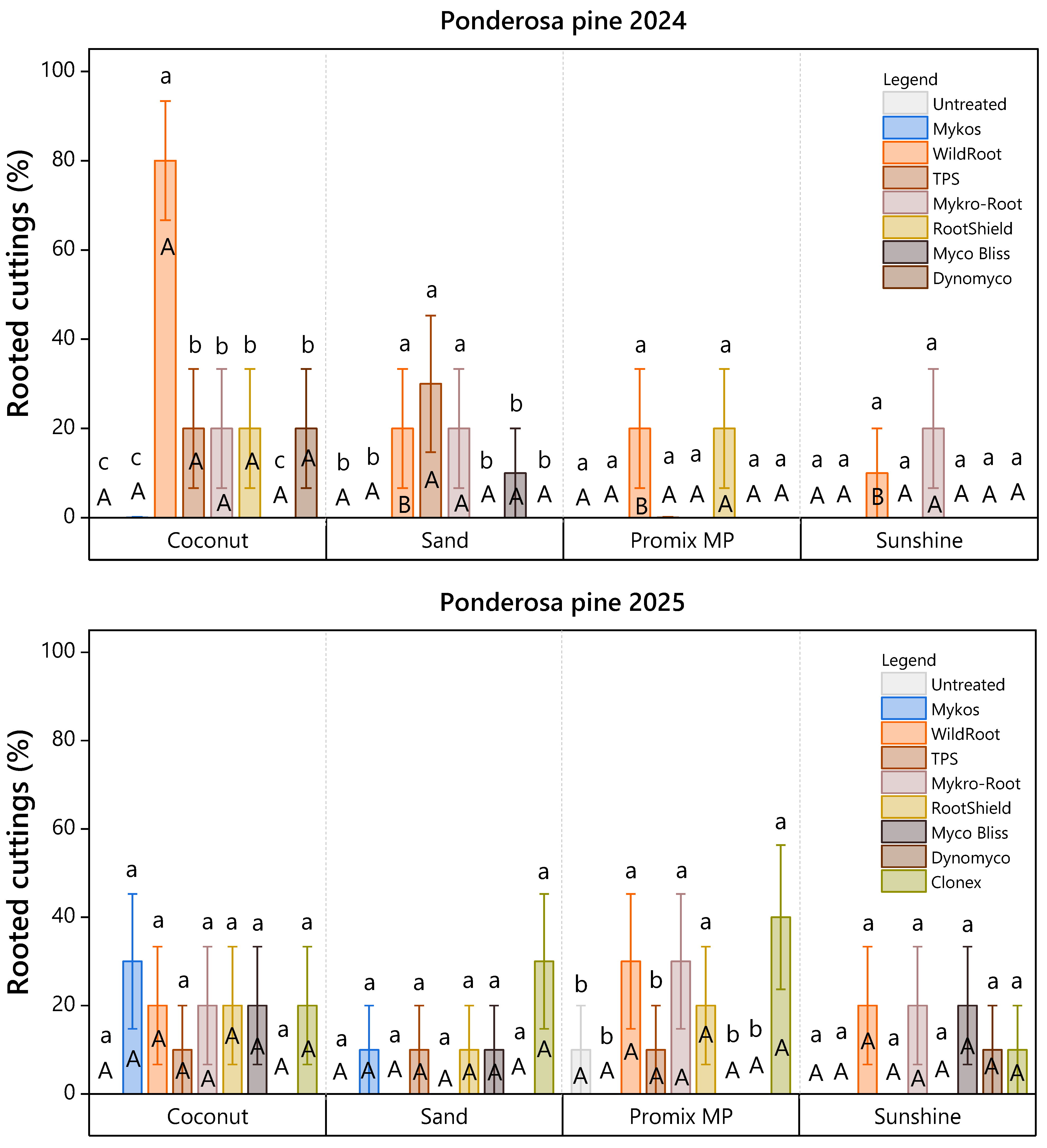 Figure 4. Rooting success of ponderosa pine cuttings (%) under eight treatments in 2024 and nine treatments in 2025 across four rooting media, assessed 107 days after planting. Lowercase letters indicate significant differences among root-promoting treatments within each medium (Scott-Knott ESD, p < 0.05), while uppercase letters indicate significant differences among rooting media within each root-promoting treatment (Tukey’s HSD, p < 0.05). Bars represent mean rooting percentages ± standard error. Each bar reflects n = 10 containers (experimental units), with 10 cuttings per substrate subplot aggregated to a single value per container.