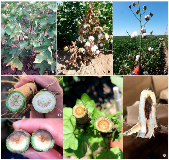 Cotton infected with V. dahliae often results in characteristic symptoms that allow for the identification of the disease in the field. However, VW symptoms may vary depending on developmental stages, genotypes, plant density, pathogen virulence and pathogen load, and environmental conditions [24]. Symptoms such as wilting and yellowing with necrosis of leaf margins often appear first on lower leaves and then progress upwards and to the whole plants (Figure 1A). Early infected plants remain stunted or killed (Figure 1B). In the field, those symptoms could be misdiagnosed with Fusarium wilt caused by Fusarium oxysporum f. sp. vasinfectum (Fov) [25]. However, V. dahliae infection in cotton often incites grey peppery discoloration in vascular tissue (Figure 1D) that is different from the vascular symptom induced by Fusarium wilt, which is often visualised with a profound brown colour (Figure 1F). Vascular discoloration is of the most diagnostic characteristics to differentiate these two wilt diseases, with a recently characterised wilt disease associated with novel Eutypella spp. Eutypella spp. infection results in reddish grey discoloration occurring in wedges on lower stems (Figure 1E) [26]. On fewer occasions, the black root rot pathogen Berkeleyomyces rouxiae can also induce black vascular discoloration restricted to the crown region (Figure 1G) that can be misdiagnosed as other wilt diseases, including VW [27]. Other symptoms, including part to complete defoliation (Figure 1C) and terminal branch die-back are also often observed in cotton plants infected with either V. dahliae or Fov [28]. Due to the overlapping of wilt disease symptoms in the field, pathogen isolation from infected tissue is one of the most reliable diagnostic methods [29].