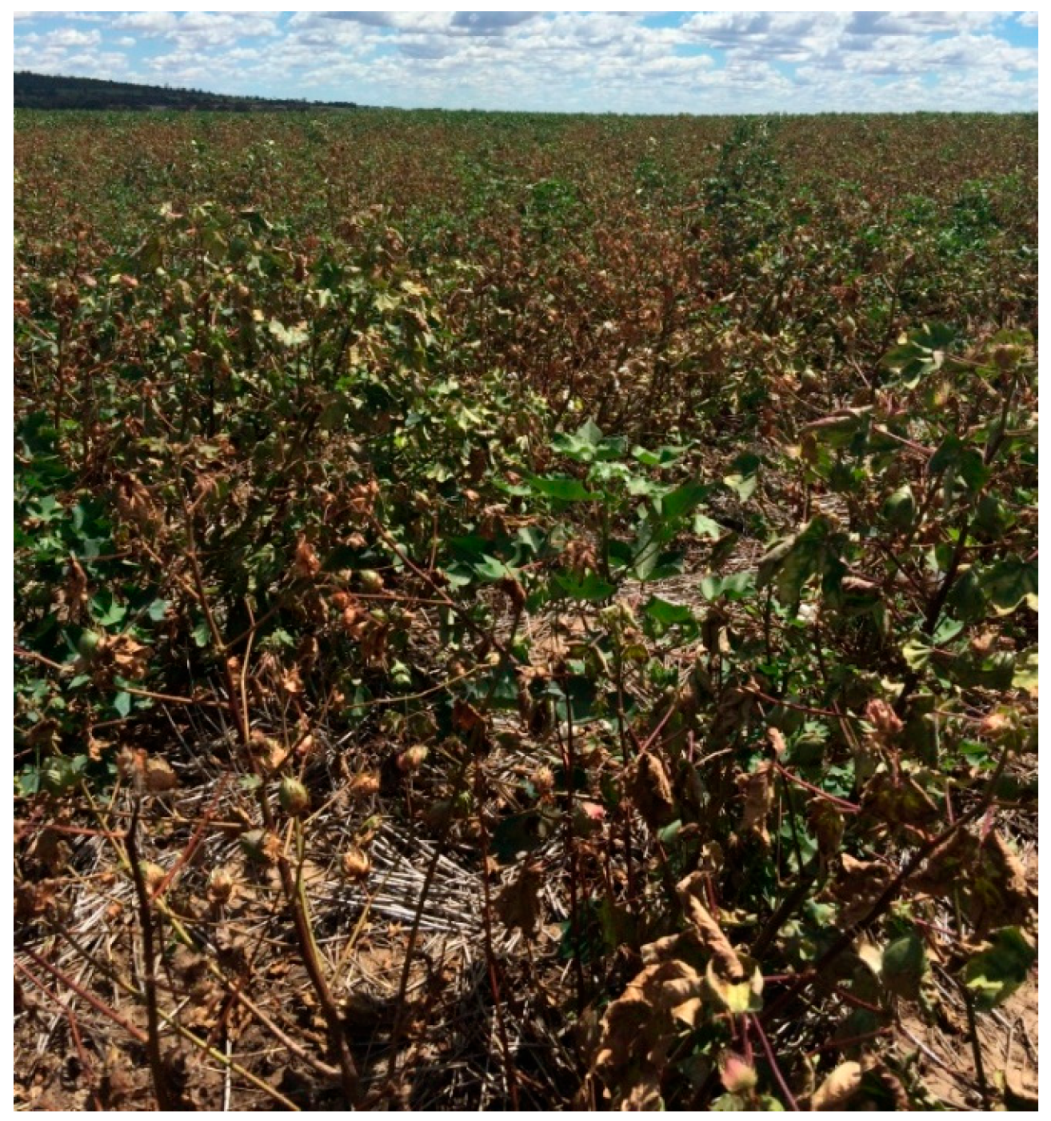 Along with organic matter inputs, irrigation and nitrogen inputs are also important to achieve targeted yield in cotton crops [8,20,138]. However, it was a trade-off between providing sufficient inputs to maximise yield and profit but at the same time not promoting excessive disease development [20]. Wheeler et al. [20] reported that the highest yield occurred with a base irrigation rate, where the irrigation was undertaken to meet 80% of the crop needs. Unfortunately, the VW rating was higher in comparison to the irrigation-reduced (half-rate) treatment. Increasing the irrigation rate to 1.5 times the base rate resulted in the highest level of VW [20,138]. On the other hand, the impact of nitrogen inputs on VW and yield was unclear [20,139]. However, excessive irrigation and nitrogen inputs may result in more VW and damage in cotton [140].