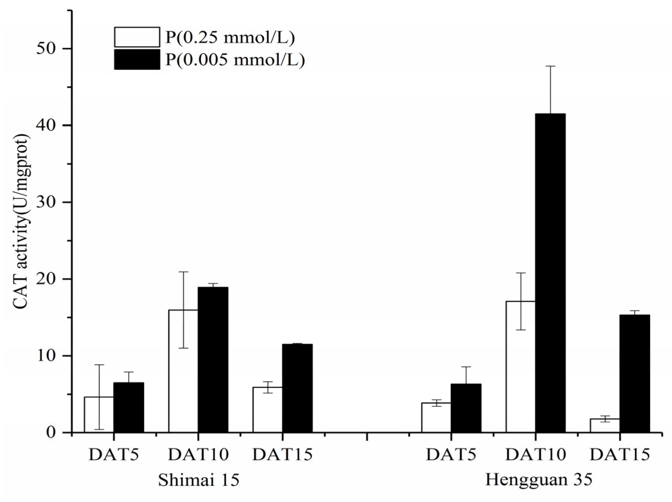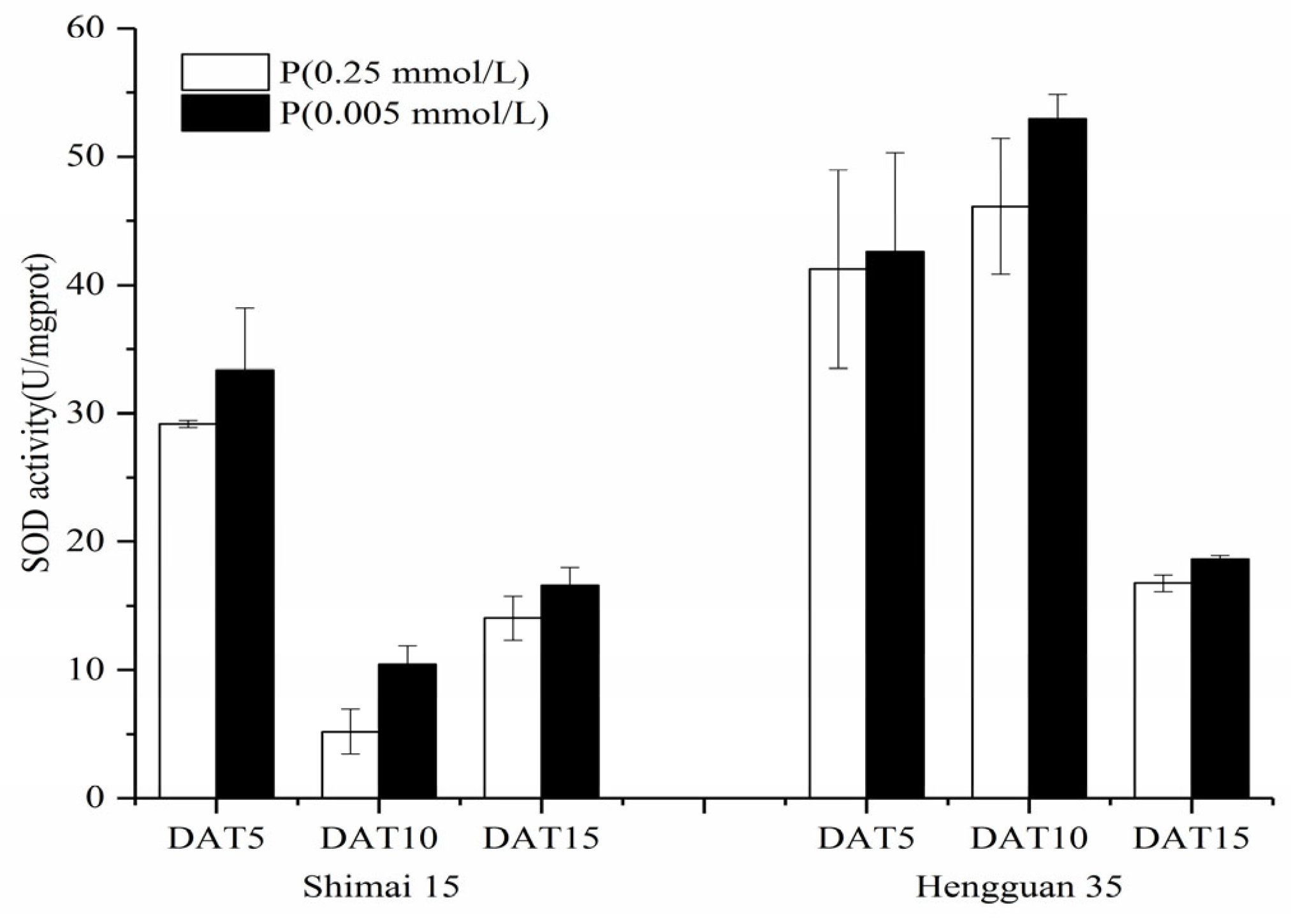 3.3. P Deficiency Affects SOD, POD, and CAT Activity in Roots of Wheat Seedlings