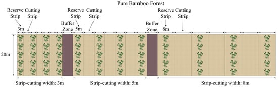 This study focused on monospecific stands of moso bamboo subjected to strip-cutting. Moso bamboo exhibit a characteristic on- and off-year cycle, in which years of abundant shoot production (“on-year”) alternate with years of low shoot emergence (“off-year”). In November 2023 (off-year), typical pure moso bamboo stands were selected for strip-cutting treatments, with a 8 m buffer zone established between plots subjected to different cutting widths (Figure 6). Strip-cutting removed all bamboo culms within the plot, while two adjacent reserve plots were maintained to provide physiological support and nutrient supply to the cutting plot. No management practices were carried out in all of the sample plots during the restoration period. The harvesting operations were completed in December 2023. From April to June 2024 (on-year), newly emerged shoots were surveyed, and understory vegetation diversity was assessed in August 2024.