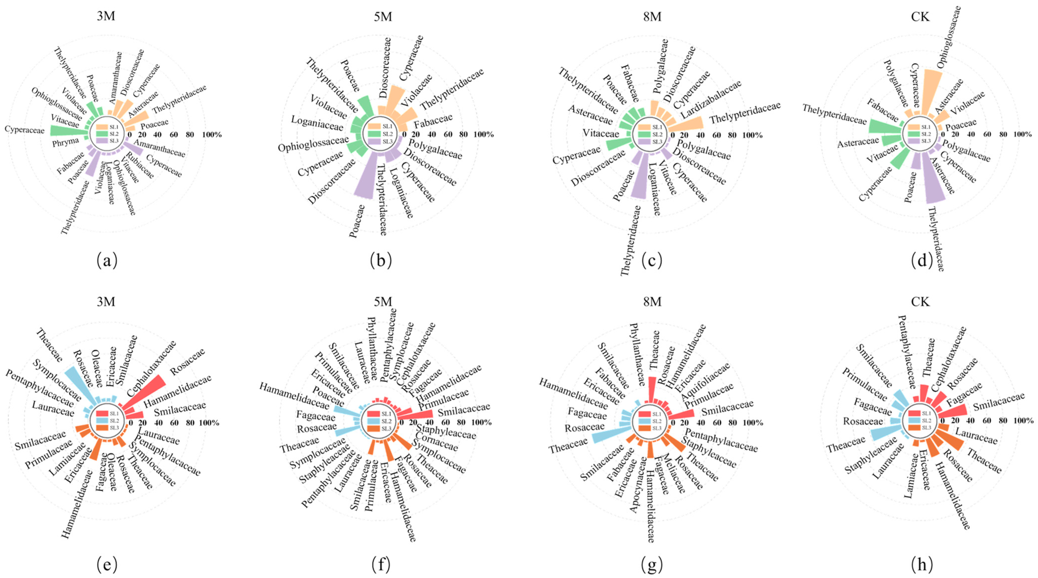 2.1. Species Composition and Importance Value of Understory Vegetation Under Different Strip-Cutting Widths and Slope Gradients