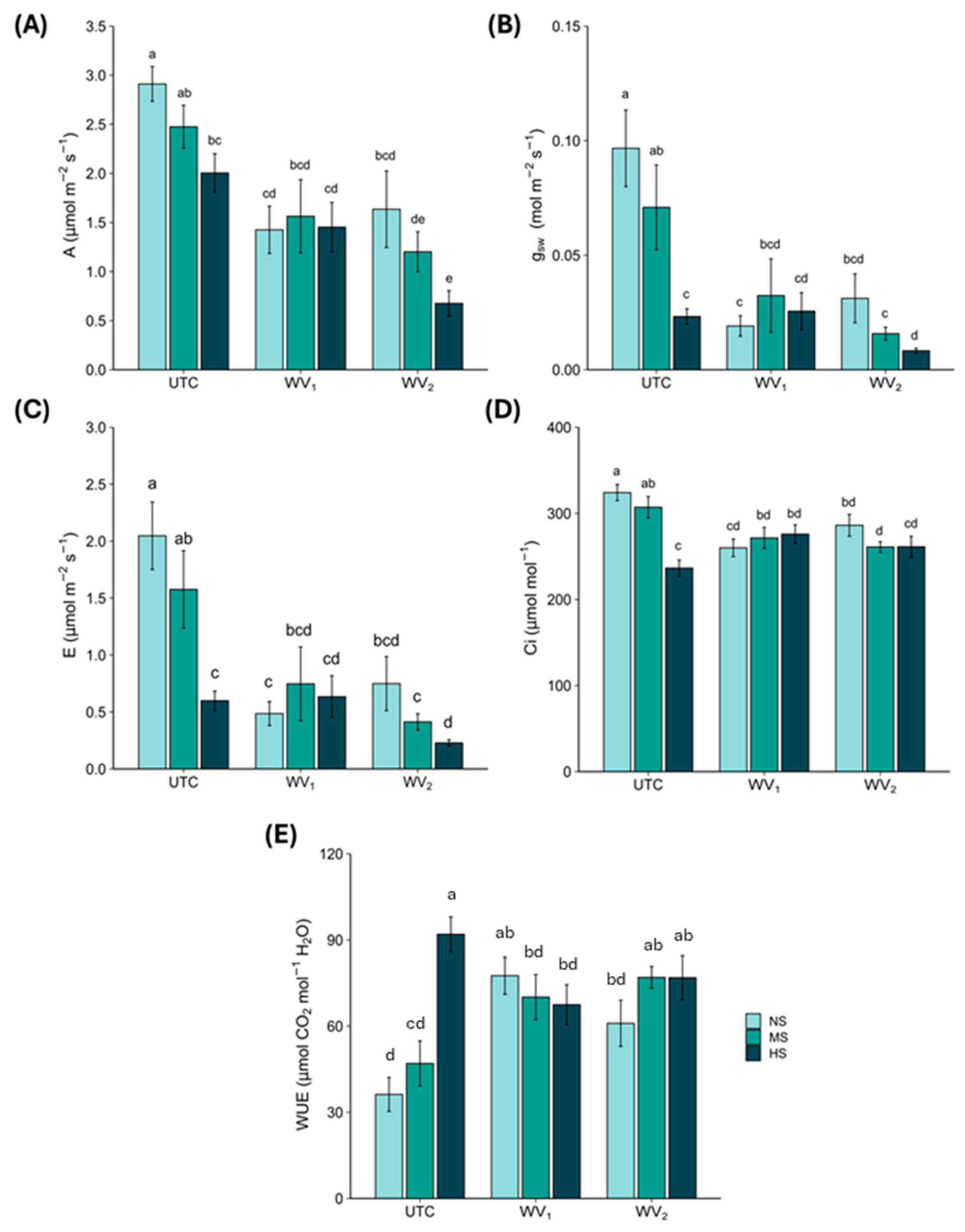 | WV2 | NS | 0.36 ± 0.03 a | 1.09 ± 0.12 ab |
