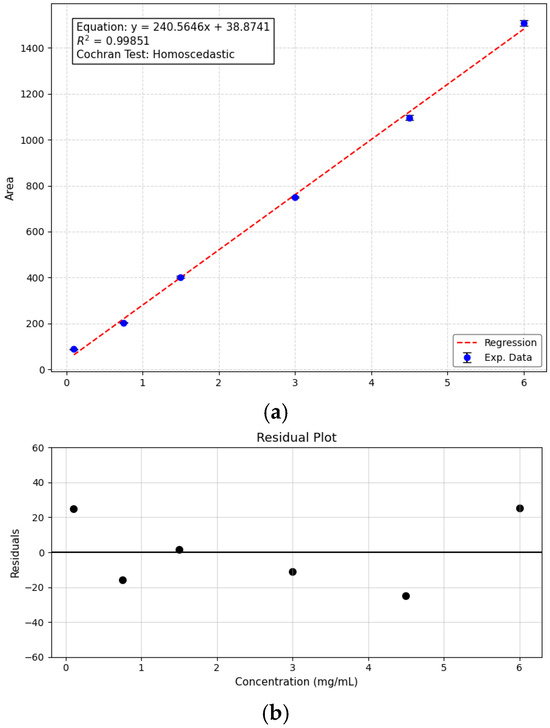 (a) Analytical curve for FAME quantification in macauba (Acrocomia aculeata) oils by GC-FID using methyl n-heptadecanoate in six different concentrations. (b) Residual plot for analytical curve for FAME quantification in macauba oils. The random dispersion of residuals around the zero line indicates homoscedasticity, meaning the error variance is constant.