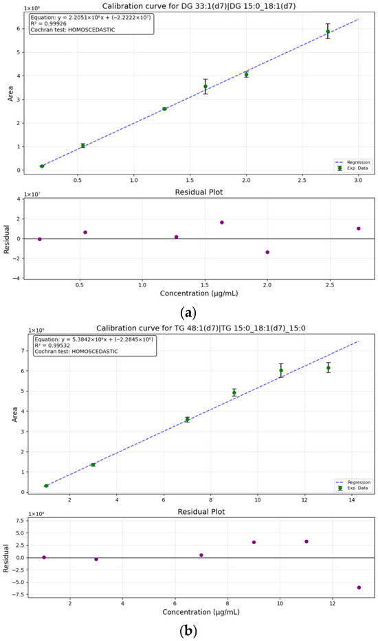 Calibration curve for lipid quantification in macauba (Acrocomia aculeata) oils by LC-HRMS using DG 33:1(d7)|DG 15:0_18:1(d7) (a) and TG 48:1(d7)|TG 15:0_18:1(d7)_15:0 (b) in six different concentrations. Both with the residual plot for the respective curve. The random dispersion of residuals around the zero line indicates homoscedasticity, meaning the error variance is constant.