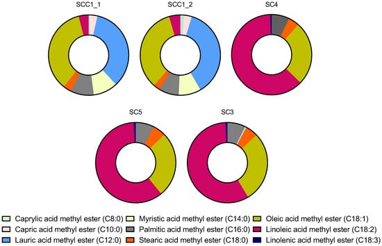 Oleic acid methyl ester (C18:1), together with lauric acid mehyl ester (C12:0), were showed the highest concentrations in samples SCC1_1 and SCC1_2, with 33.56 and 31.77 g g oil−1, respectively. Samples SC4, SC5, and SC3 also contained substantial amounts of C18:1 (29.41, 23.11, and 24.05 g g oil−1, respectively). Linoleic acid methyl ester (C18:2) was the predominant component in samples SC4, SC5, and SC3, with concentrations of 69.65, 52.89, and 48.72 g g oil−1, respectively. In contrast, SCC1_1 and SCC1_2 exhibited the lowest C18:2 concentrations, with 3.80 and 4.18 g g oil−1.