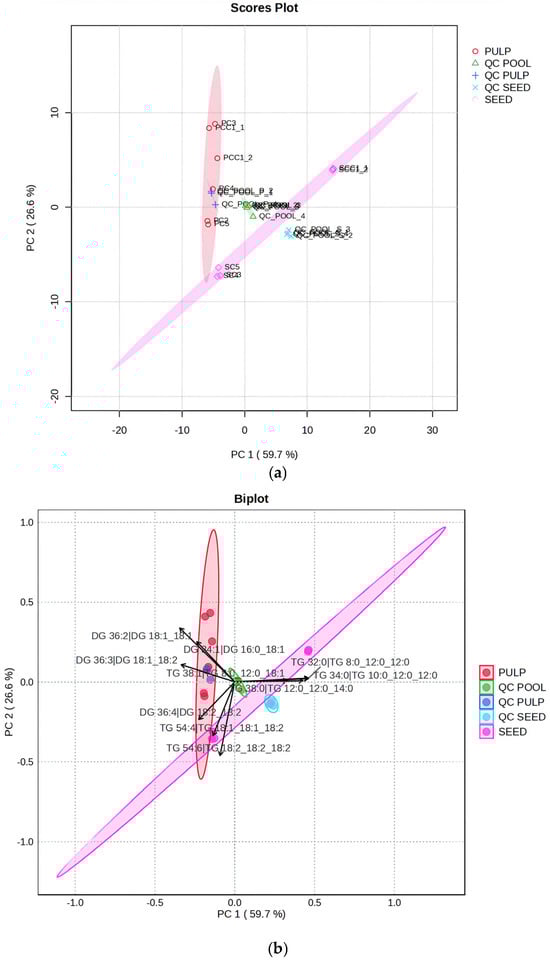 Scored (a) and biplot (b) plots of principal component analysis (PCA) of the lipid profile of commercial macauba (Acrocomia aculeata) oil samples from pulp and seed. The lipid classes listed in Figure (b) are triacylglycerol (TG) and diacylglycerol (DG).