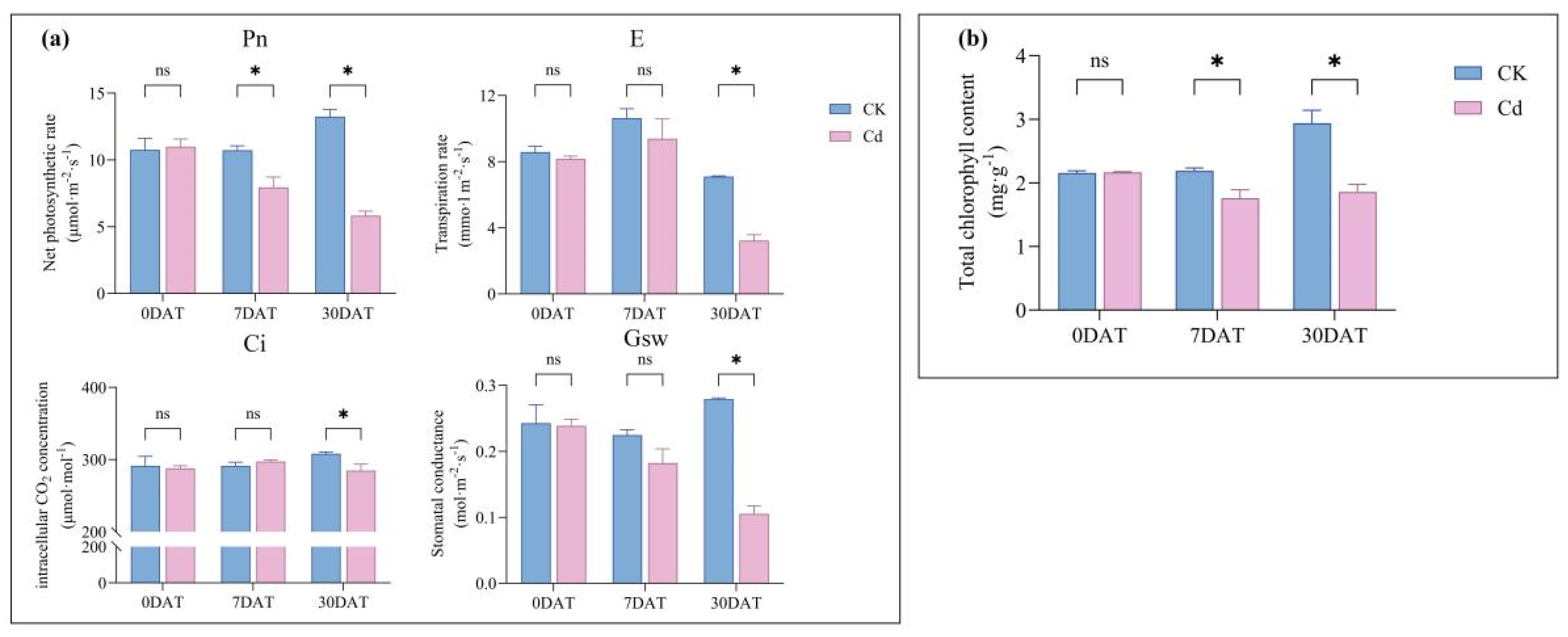 2.2. Changes in Photosynthetic Parameters and Chlorophyll Content