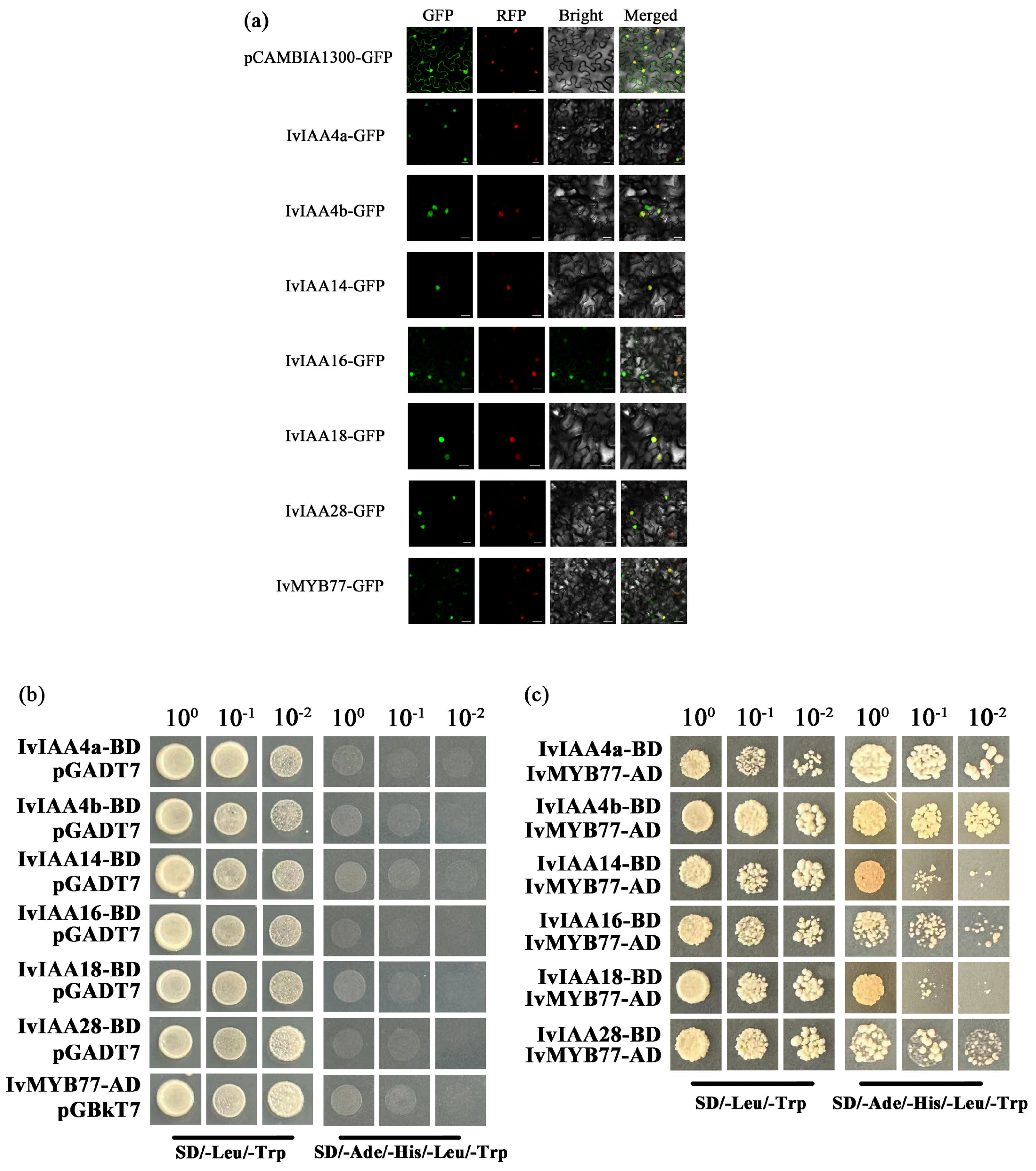 2.9. Subcellular Localization of IvIAA Proteins and Their Interaction with IvMYB77