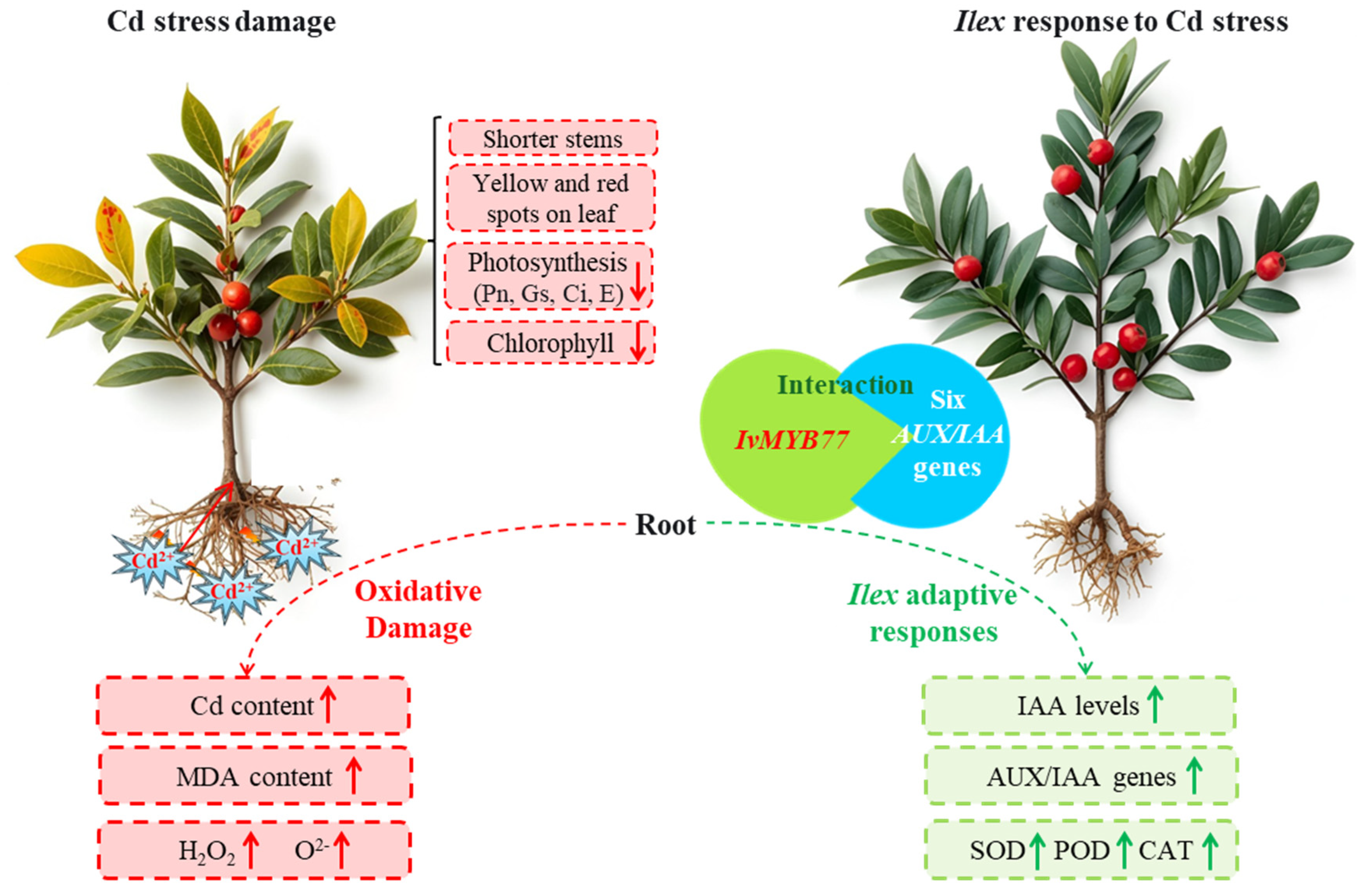Shen Q, Huang L, Ji P, Rao MJ, Li W, Zuo J, Yuan H, Yan D, Wang X, Zheng B. Cadmium Stress Disrupts Auxin Signaling and Growth in Ilex verticillata: Insights from Physiological and Transcriptomic Analyses. Plants. 2026; 15(2):277. https://doi.org/10.3390/plants15020277