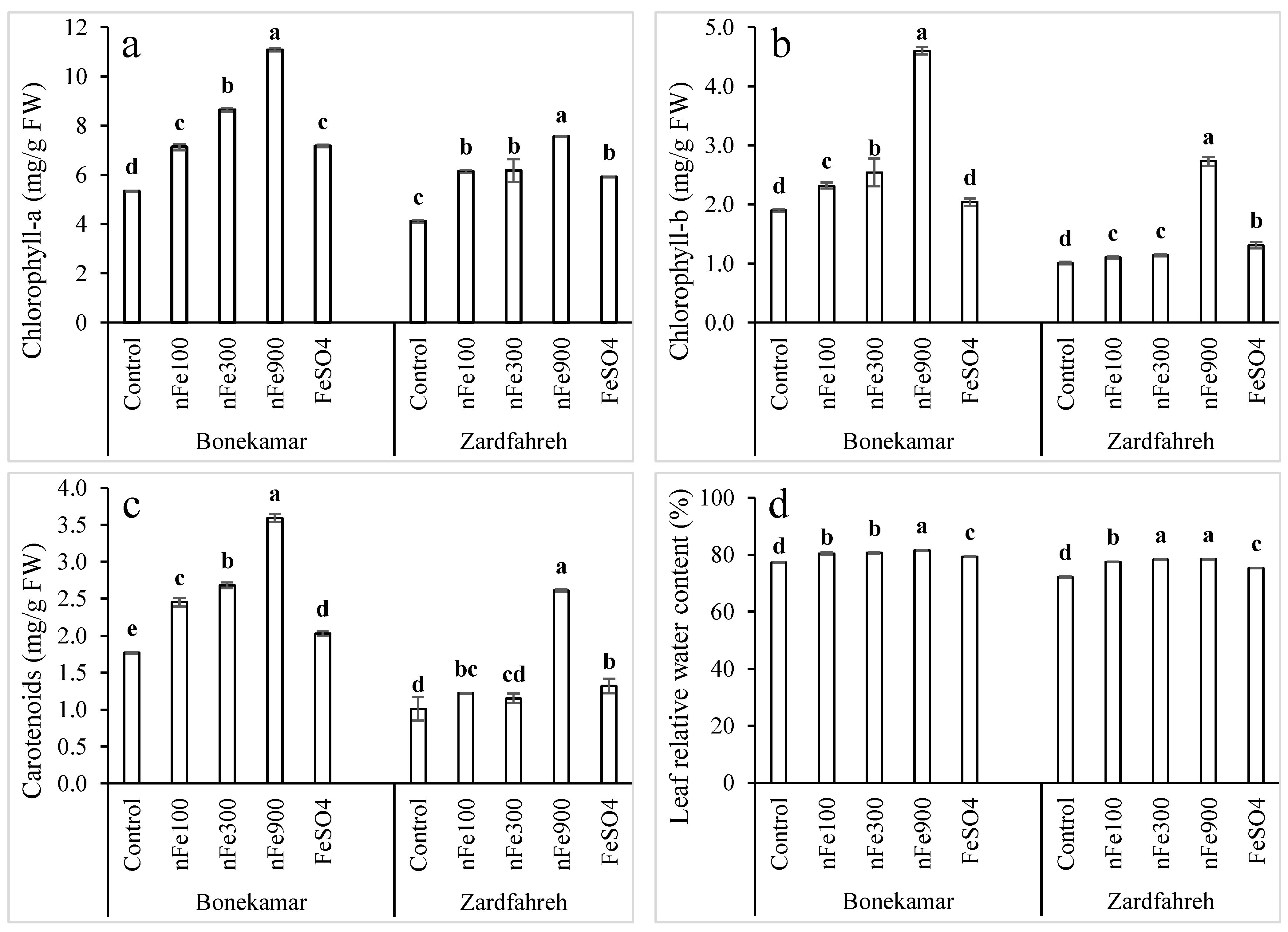 - Ibrahem, N.; Latif, H.H.; Seif, M.; Mogazy, A.M. Impact of different crystal sizes of nano-iron oxide as fertilizer on wheat plants photosynthetic pigments content. Egypt. J. Chem. 2021, 64, 4635–4639. [Google Scholar] [CrossRef]