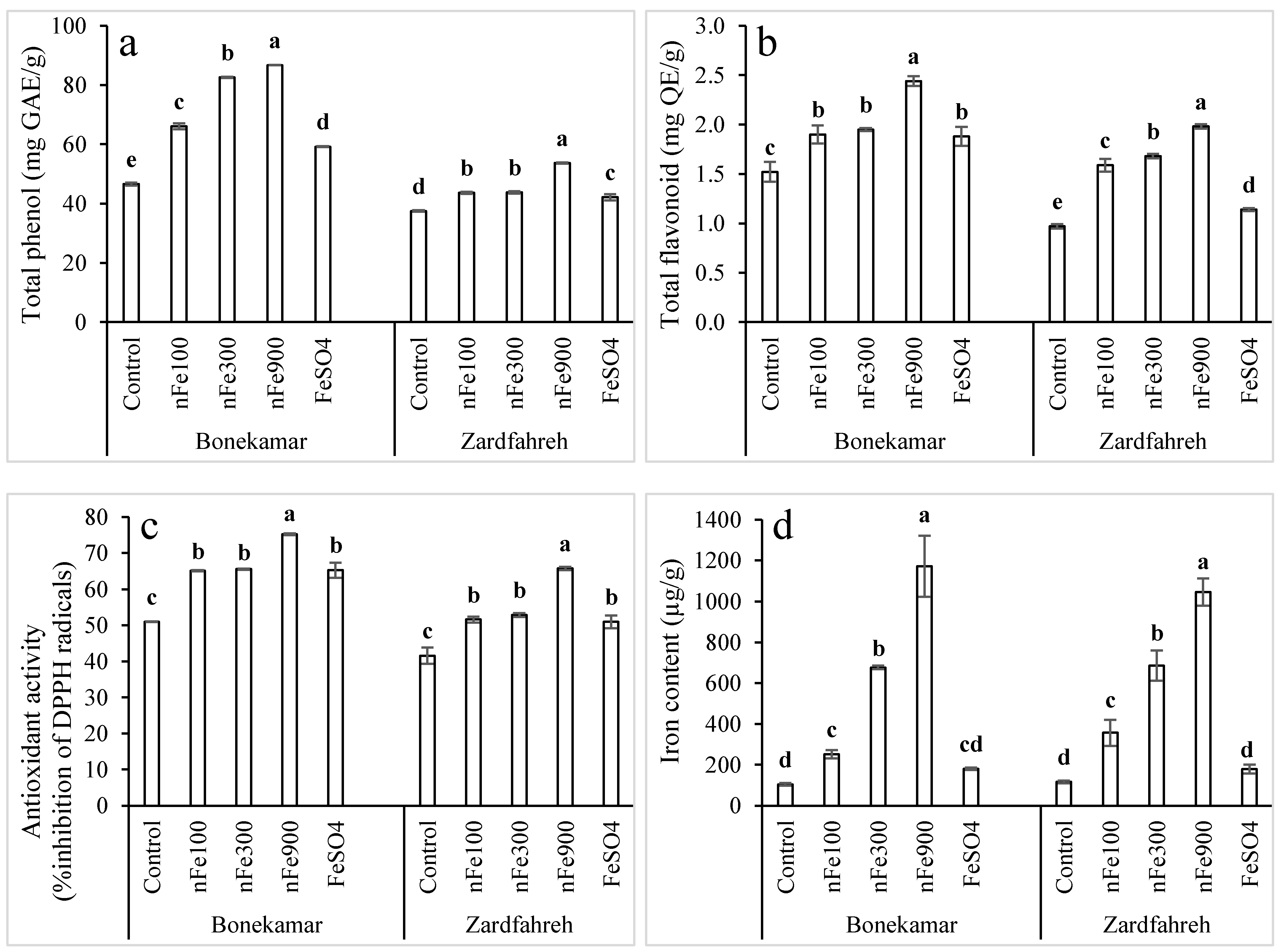 - Khanizadeh, P.; Mumivand, H.; Morshedloo, M.R.; Maggi, F. Application of Fe2O3 nanoparticles improves the growth, antioxidant power, flavonoid content, and essential oil yield and composition of Dracocephalum kotschyi Boiss. Front. Plant Sci. 2024, 15, 1475284. [Google Scholar] [CrossRef] [PubMed]