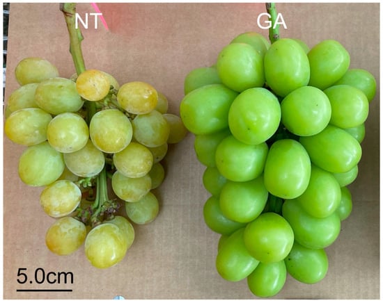 The harvested grape clusters. The photograph shows V. labruscana × V. vinifera ‘Shine Muscat’ grape clusters at DAFB105 (scale bar = 5.0 cm). GA, GA-treated clusters; NT, non-treated clusters.