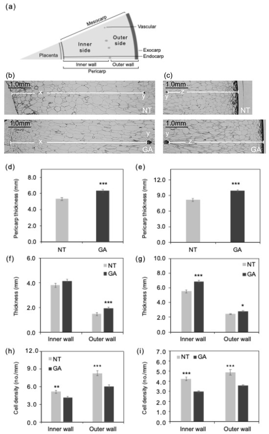 Histological characteristics of the pericarp tissue structure. (a) Schematic diagram of the structure of a fresh grape berry. Pericarp structure near the equatorial plane (b) inner wall and (c) outer wall side at DAFB105 (scale bars = 1.0 mm). x, inner wall of pericarp; y, vascular; z, outer wall of pericarp. (d,e) Pericarp thickness at DAFB39 and DAFB105, respectively. (f,g) Thickness of the inner and outer walls of the pericarp at DAFB 39 and DAFB 105, respectively. Inner wall, inner wall of the pericarp; Outer wall, outer wall of the pericarp. (h,i) Mesocarp cell density on the inner and outer sides at DAFB 39 and DAFB 105, respectively. Inner side, inner side of the mesocarp; Outer side, outer side of the mesocarp. *, p < 0.05; **, p < 0.01; ***, p < 0.001; Welch’s t-test; n = 18–23. Error bars indicate standard error. GA, GA-treated berries; NT, non-treated berries.