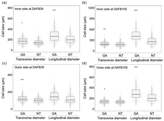 Cell size distributions of the (a) inner and (b) outer sides of the mesocarp at DAFB39 and the (c) inner and (d) outer sides of the mesocarp at DAFB105 (*, p < 0.05; **, p < 0.01; ***, p < 0.001; F-test for equality of variances; n = 360–460 cells). The box plot displays the interquartile range (IQR) with the median indicated by a horizontal line. Whiskers extend to 1.5 × IQR, jittered points represent individual cell measurements, and the mean is denoted by a plus sign (+). Inner side, inner side of the mesocarp; Outer side, outer side of the mesocarp; GA, GA-treated berries; NT, non-treated berries; Transverse, circumferential on the equatorial plane of the berry; Longitudinal, radial on the equatorial plane of the berry.