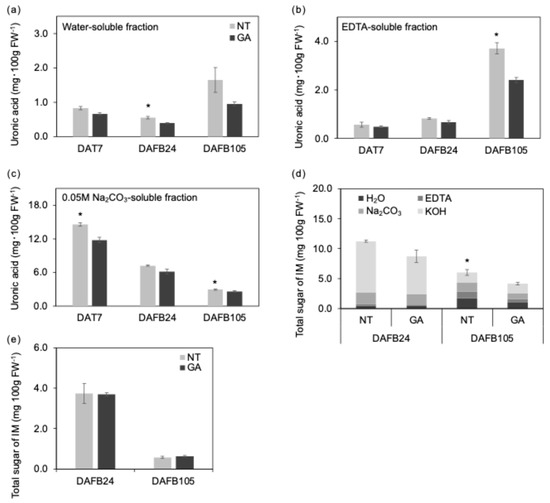 Cell wall components in the mesocarp and endocarp. (a) Water-soluble, (b) EDTA-soluble, and (c) 0.05 M Na2CO3-soluble uronic acid contents were pectin-related. (d) Hemicellulose-related sugar content. H2O, water-soluble fraction; EDTA, EDTA-soluble fraction; Na2CO3, 0.05 M Na2CO3-soluble fraction; KOH, 4 M KOH-soluble fraction. (e) Insoluble material (IM). *, p < 0.05; n = 3. Error bars indicate standard error. GA, GA-treated berries; NT, non-treated berries.