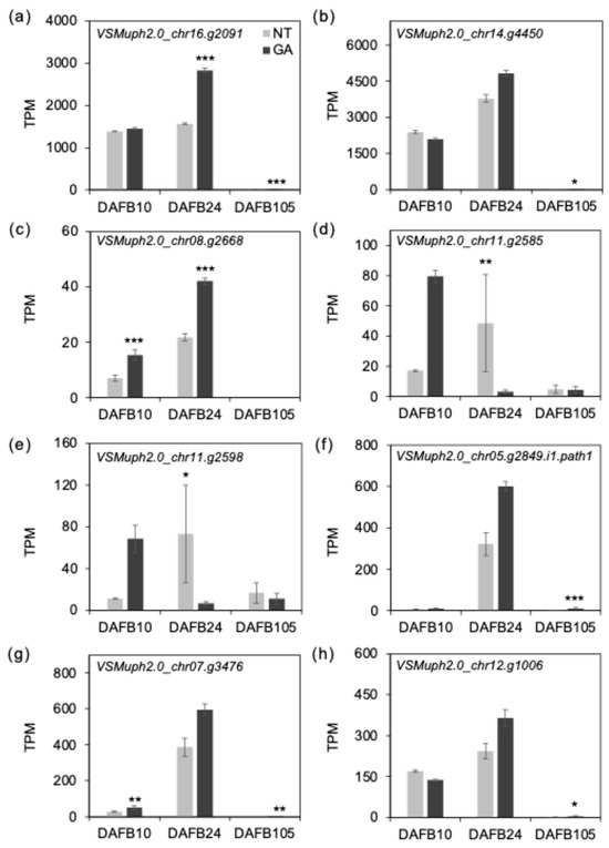 Expression of putative cell expansion-related genes. TPM values of (a) VSMuph2.0_chr16.g2091 (EXORDIUM-Like 3), (b) VSMuph2.0_chr14.g4450 (expansin A1), (c) VSMuph2.0_chr08.g2668 (xyloglucan endotransglucosylase/hydrolase 32), (d) VSMuph2.0_chr11.g2585 (xyloglucan endotransglycosylase 6), (e) VSMuph2.0_chr11.g2598 (xyloglucan endotransglycosylase 6), (f) VSMuph2.0_chr05.g2849 (xyloglucan endotransglucosylase/hydrolase 15), (g) VSMuph2.0_chr07.g3476 (xyloglucan endotransglucosylase/hydrolase 7) and (h) VSMuph2.0_chr12.g1006 (xyloglucan endotransglucosylase/hydrolase 9). Error bars indicate standard error, n = 3. *, padj < 0.05; **, padj < 0.01; ***, padj < 0.001. GA, GA-treated berries; NT, non-treated berries.