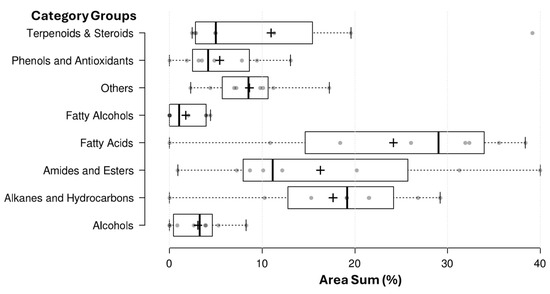 A total of 71 distinct phytochemical compounds were identified across the eight examined species (Supplementary Table S1), and their distribution among the major compound classes is summarized below. Boxplot analysis of the eight major compound classes revealed distinct patterns in abundance and distribution across the analyzed plant samples (Figure 1). Among the compound groups, fatty acids exhibited the highest overall abundance, with a median value of 28.99 and an upper whisker extending to 38.40, reflecting their broad presence and potential roles in membrane structure and stress resilience. Alkanes and hydrocarbons followed with a median of 19.13 and a wide range up to 29.20, indicating their common occurrence but highly variable accumulation, likely reflecting wax or cuticle-associated metabolic profiles. Amides and esters also showed strong representation, with a median of 11.12 and values extending to 40.00, suggesting their contribution to both primary and specialized metabolism across species. Phenols and antioxidants displayed moderate accumulation (median 4.16, max 13.05), pointing to species-dependent antioxidant profiles. Similarly, terpenoids and steroids exhibited a median of 4.96 with an upper whisker of 19.57, consistent with the sporadic but notable presence of phytosterols and triterpenoids in select species. Alcohols and fatty alcohols showed lower medians (3.22 and 1.01, respectively), with some samples displaying moderate enrichment, possibly linked to cuticular or volatile biosynthesis. Lastly, the others category (including alkenes, piperidine derivatives, quinones, and fluorophores) revealed a compressed but measurable distribution (median 8.48), highlighting the selective biosynthesis of these chemically diverse metabolites. Together, the distribution patterns reinforce a dominant biochemical core of lipids and hydrocarbons, with layered contributions from secondary metabolites that vary among species and are likely to contribute to ecological adaptation (see Figure 2).