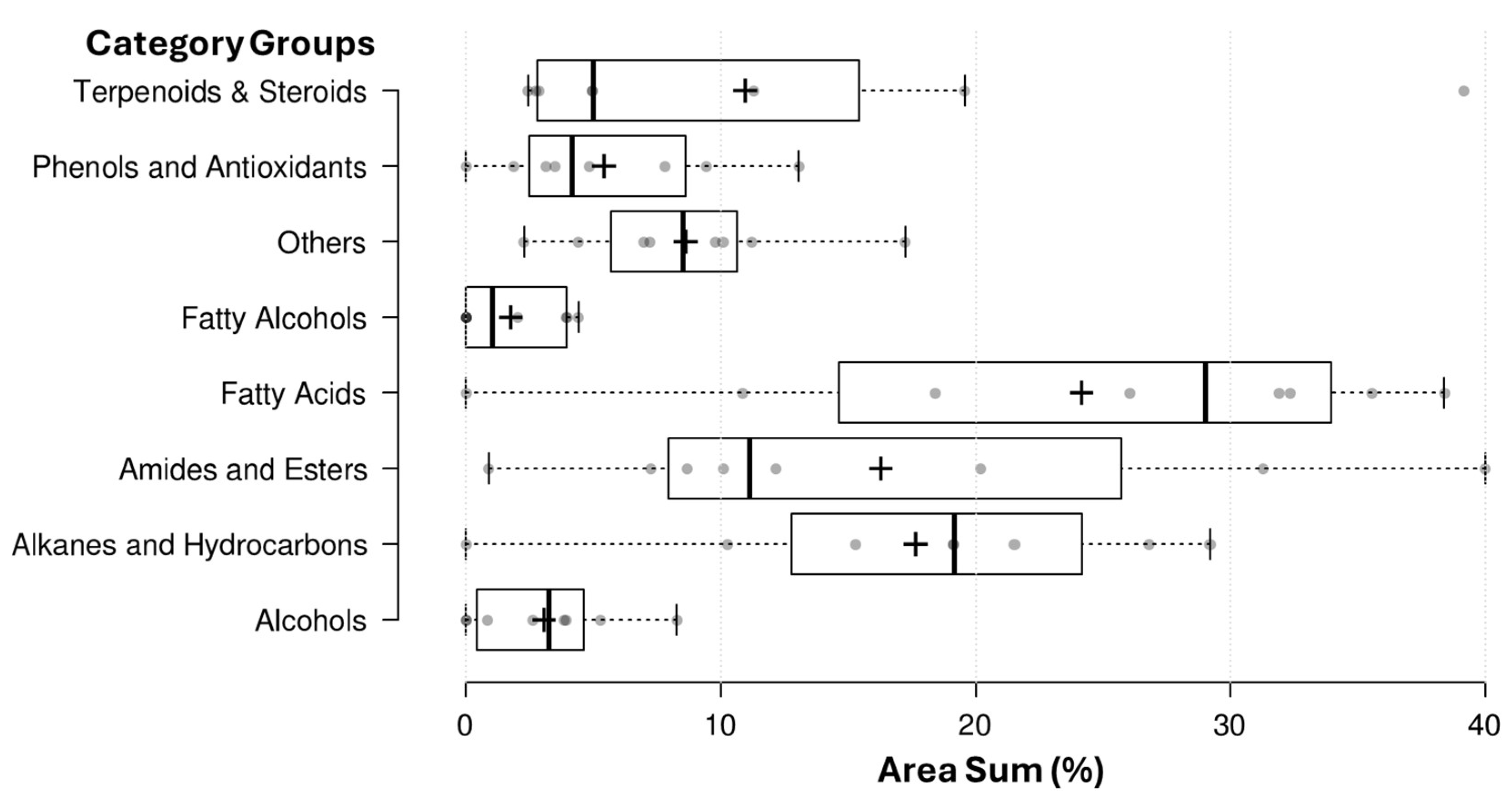 A boxplot summary of major compound classes detected across the eight analyzed plant species. The eight groups include: Alcohols, Alkanes and Hydrocarbons, Amides and Esters, Fatty Acids, Fatty Alcohols, Others (including alkenes, piperidine derivatives, quinones, and fluorophores), Phenols and Antioxidants, and Terpenoids and Steroids. Each box represents the interquartile range (IQR), with the horizontal line indicating the median, and whiskers extending to the lowest and highest values within 1.5 × IQR.