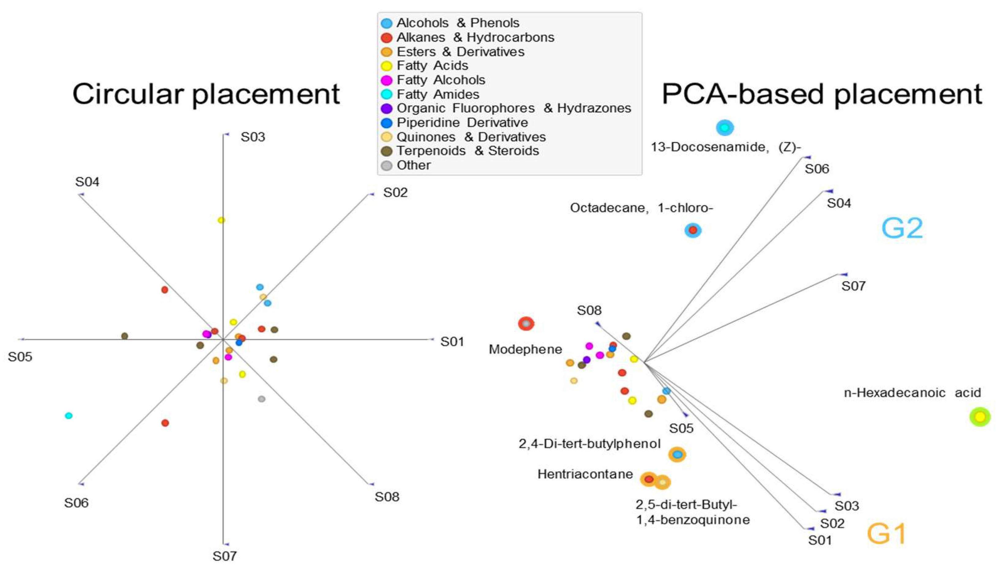 The corresponding FreeViz projection provides a visual summary of compound distribution across species. (Left), samples were initially arranged in a circular layout with equal spacing to reflect an unbiased start. (Right), PCA-based projection arranged the samples based on their chemical profiles, showing clear separation between Group 1 (G1: C. crinitum [S01], T. terrestris [S02], C. monacantha [S03]) and Group 2 (G2: C. pallida [S04], C. conglomeratus [S06], I. argentea [S07]), while L. pyrotechnica [S05] and A. monosperma [S08] appeared as outliers. Those compounds most associated with G1 and G2 are highlighted with group-specific outlines.