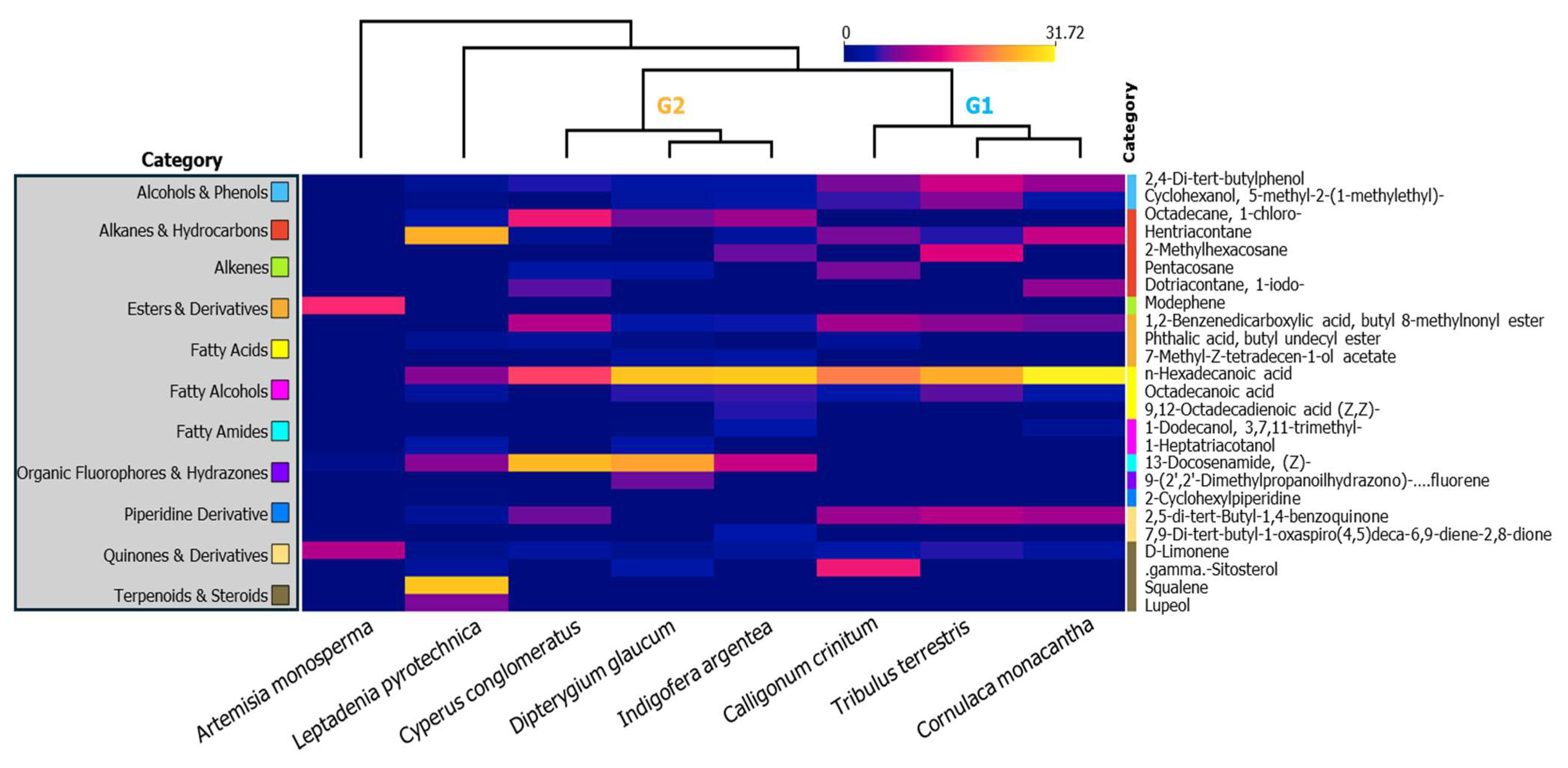 Phenols and Antioxidants. 2,4-Di-tert-butylphenol, a potent antioxidant, was abundant in G1 species (T. terrestris, C. monacantha, C. crinitum), contributing to their clustered profile. Cyclohexanol, 5-methyl-2-(1-methylethyl)-, although structurally closer to an alcohol, appeared in the same taxa and supported a shared oxidative stress mitigation strategy. These compounds were absent in A. monosperma, and only faintly present in C. pallida and L. pyrotechnica, marking a clear chemical division.