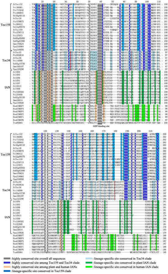 Previous studies indicate that the C-terminal M domain of Toc34 and the TM domain of Toc159 are responsible for subcellular localization within the plastid protein import pathway. Using SMART, Pfam, and MEME analyses, we confirmed that the M domain is specific to the Toc34 lineage. This domain is predominantly composed of hydrophilic amino acid residues and functions as a membrane anchor (Figure S1A). Conversely, the TM domain is specific to the Toc159 lineage; it spans 241–244 mainly hydrophobic amino acids and serves as a transmembrane targeting signal (Figure S1B). Furthermore, we identified 18 invariable amino acid sites within the M domain of Toc34 proteins and 51 within the TM domain of Toc159 proteins. This strong conservation strongly suggests that these domains are functionally important across all green plants. Since our analysis indicates that IAN proteins contain only an AIG1 domain and share more sites with human AIG1 domain-containing proteins, we speculate that IAN genes may represent the ancestral state of plant AIG1 genes.