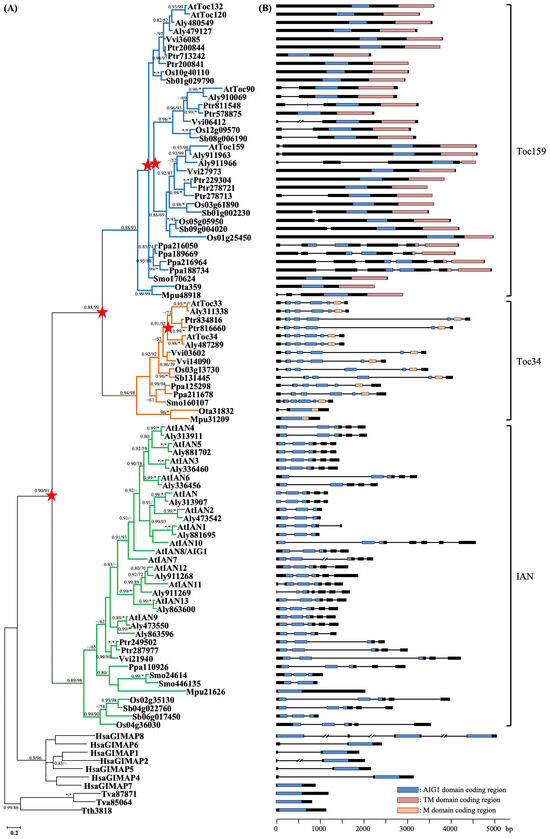 To identify homologs of Toc34, Toc159, and IAN proteins, we performed Hidden Markov Model (HMM) searches against the predicted proteomes of 13 organisms with fully sequenced genomes [68], including ten plant species and three non-plant species used as outgroups (see Table S1). The proteomes and corresponding genome data were obtained from publicly available databases, including Phytozome (https://phytozome-next.jgi.doe.gov, accessed on 12 January 2025), the National Center for Biotechnology Information (NCBI, http://www.ncbi.nlm.nih.gov, accessed on 15 January 2025), The Arabidopsis Information Resource (TAIR, http://www.arabidopsis.org, accessed on 15 January 2025), and EnsemblProtists (http://protists.ensembl.org, accessed on 18 January 2025). The HMM profile for the AIG1 domain (PF04548, build 2.3.2) was downloaded from the Pfam database (http://pfam.xfam.org, accessed on 22 January 2025). The initial dataset was filtered to remove sequences lacking the AIG1 domain using the online tools available on the SMART and Pfam websites. Additionally, AIG1-like protein sequences were retrieved from 12 additional plant species of phylogenetic importance by performing BLASTP v2.16.0 searches against the NCBI non-redundant protein database (nr) (Table S1). Multiple known AIG1-like proteins were used as queries to ensure comprehensive retrieval. An E-value cutoff of 10−5 was applied in both the HMM and BLASTP searches.