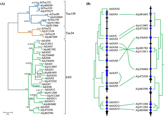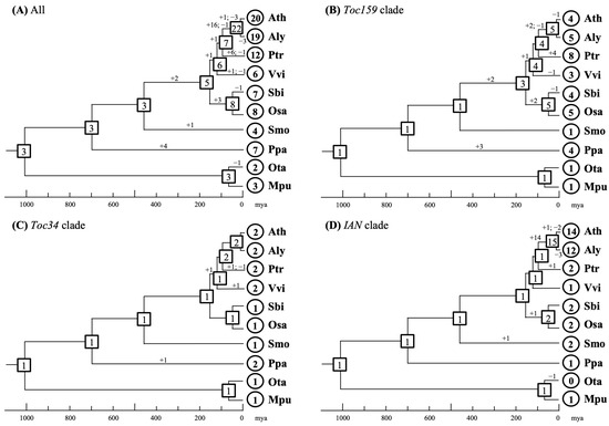 Previous studies have indicated that IAN genes in A. thaliana are organized into tandem arrays within certain chromosomal regions, suggesting that tandem duplication plays a significant role in their expansion. However, the mechanisms generating duplicate genes in other parts of the IAN lineage, as well as in the Toc34 and Toc159 lineages, remain unclear. By comparing the genomic locations of orthologous gene pairs, we detected clear microsynteny between the analyzed genomes, including instances of segmental inversion (Figure 4 and Figure S3).