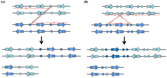 The classical model of tandem duplication involves unequal crossing over during homologous recombination, typically mediated by flanking direct repeat sequences [54] (Figure 5A). In this scenario, recombination occurs between the same DNA strands (e.g., both forward strands) of homologous chromosomes, invariably preserving the original orientation of the duplicated segment [55]. In contrast, the head-to-head arrangements we identified are associated with the presence of reverse complementary repeats, including palindromic sequences, within the intergenic regions where duplication occurred [56,57] (Figure 5B). These structural features could facilitate unequal crossing over between opposite DNA strands (e.g., forward and reverse strands) of homologous chromosomes [58]. Recombination at such sites would invert the orientation of the newly duplicated copy relative to its progenitor, thereby producing the observed head-to-head gene pairs [57,59,60]. The consistent presence of these reverse complementary or palindromic sequences in all relevant intergenic regions supports a high probability for this inversion-mediated duplication mechanism. Furthermore, head-to-head gene pairs often share a single intergenic promoter region, which may allow for their coordinated co-expression, a functional implication that warrants experimental validation [59,60,61]. While this mechanism appears prominent in the expansion of AIG1-like genes, its prevalence in other gene families remains to be determined through broader genomic analyses.