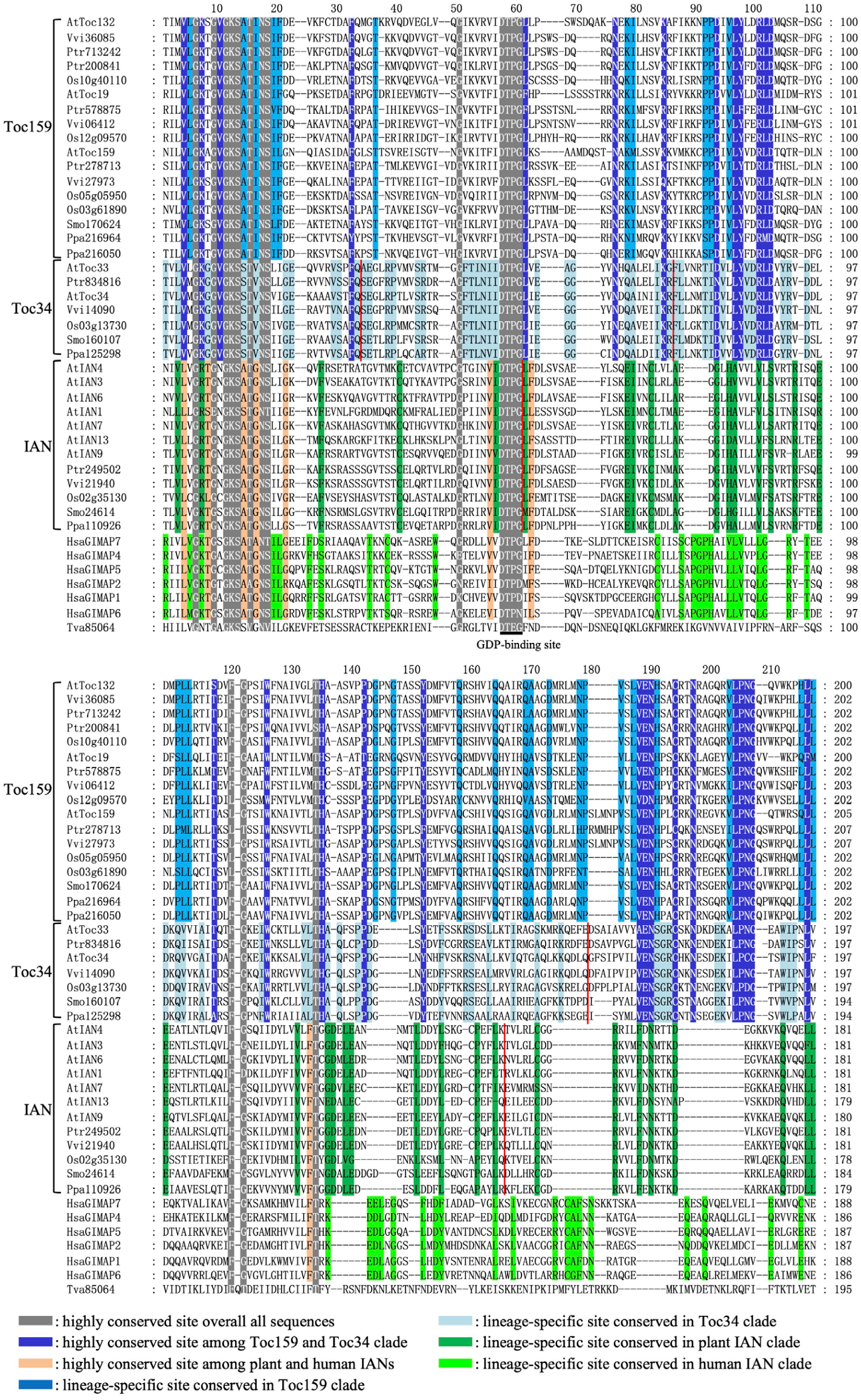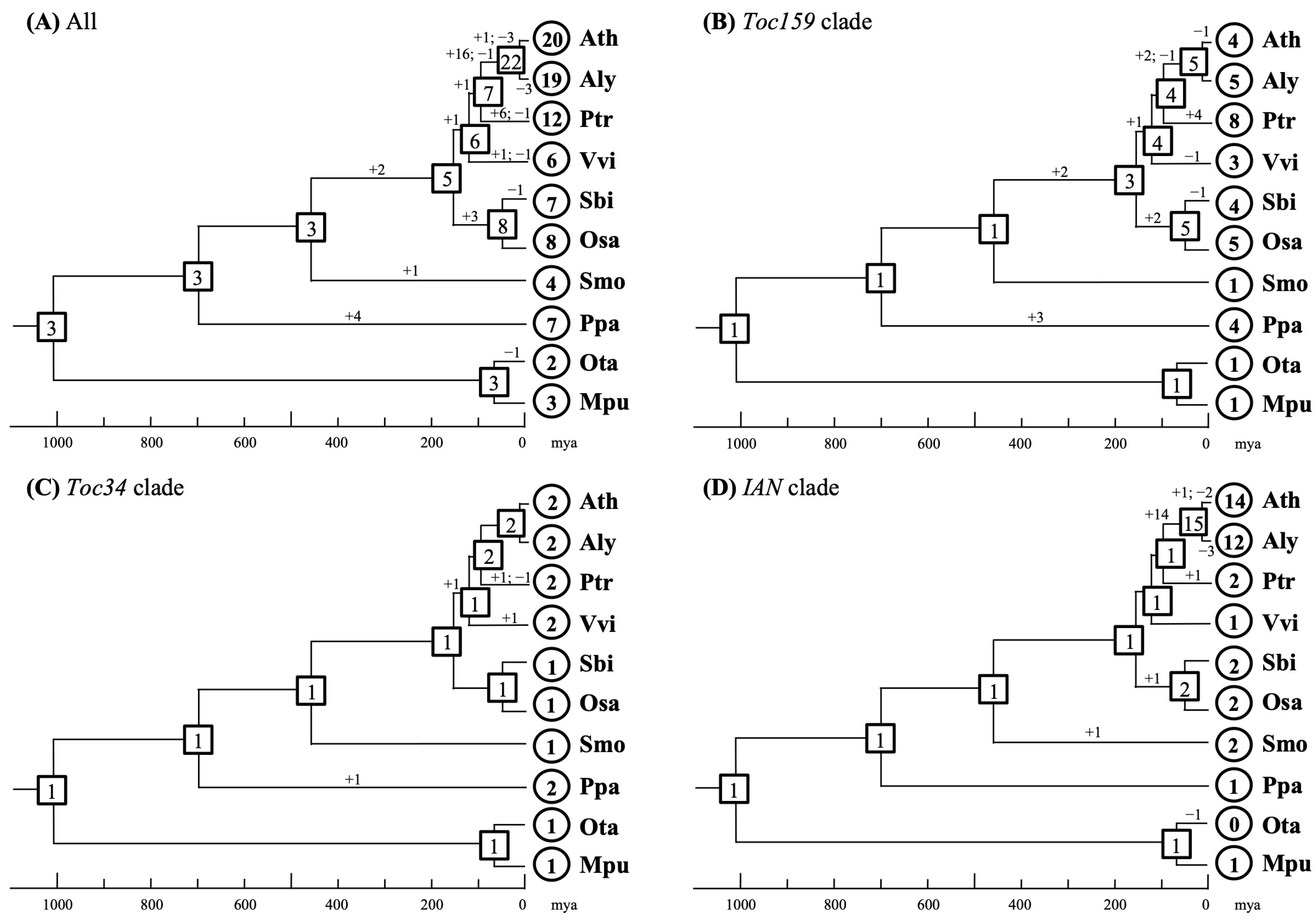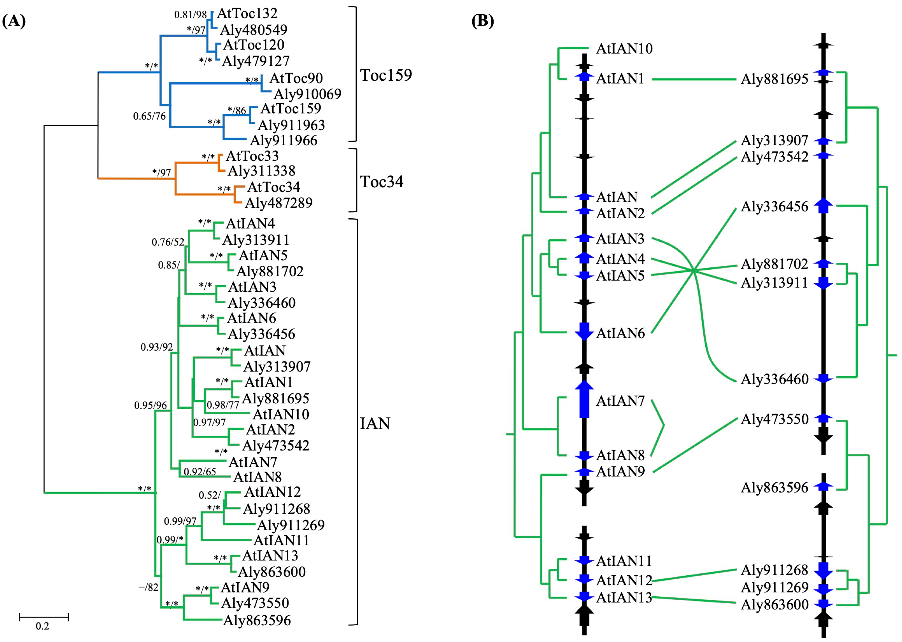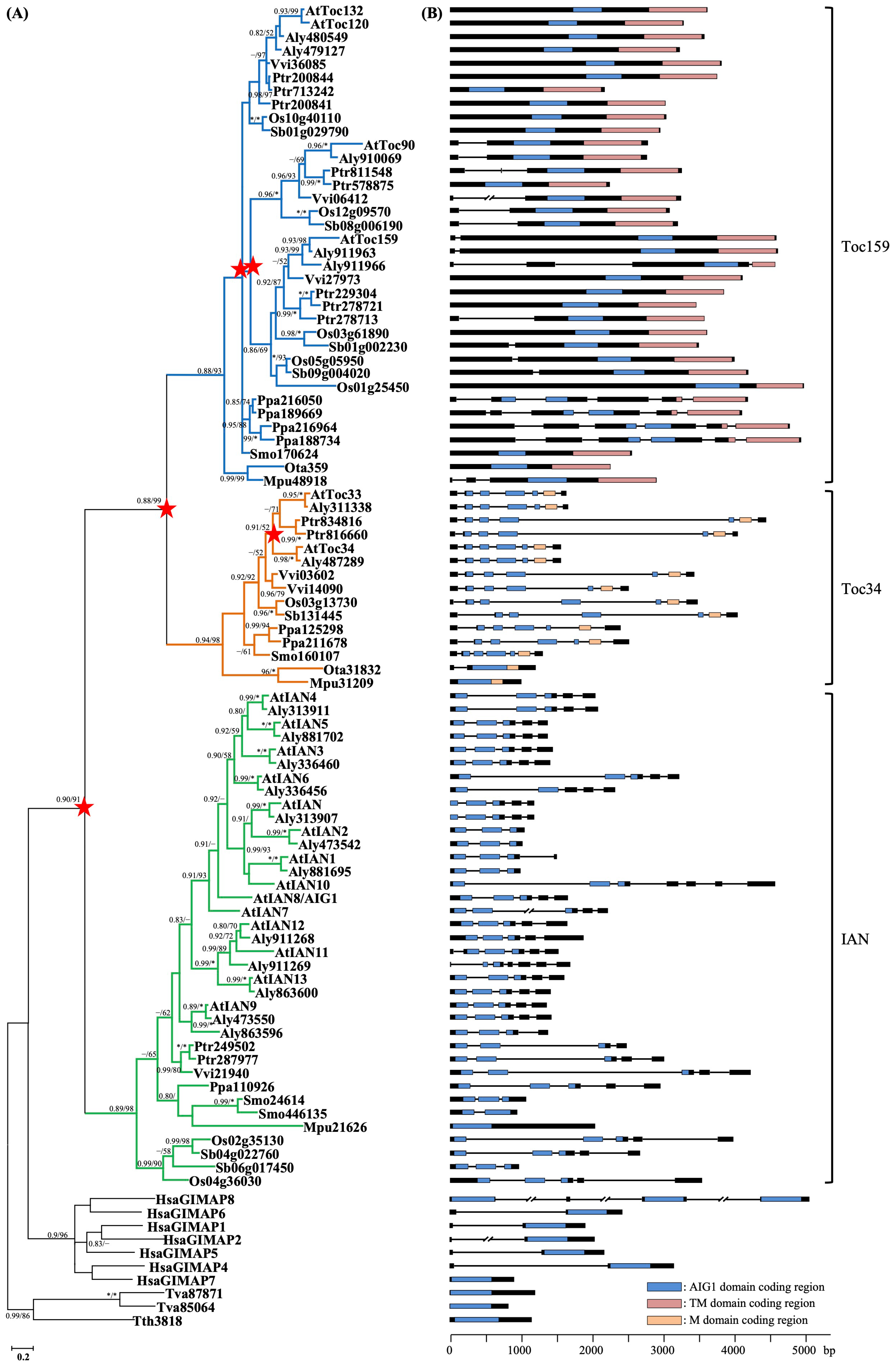 2.2. Phylogenetic Relationships of Plant Toc34, Toc159 and IAN Genes