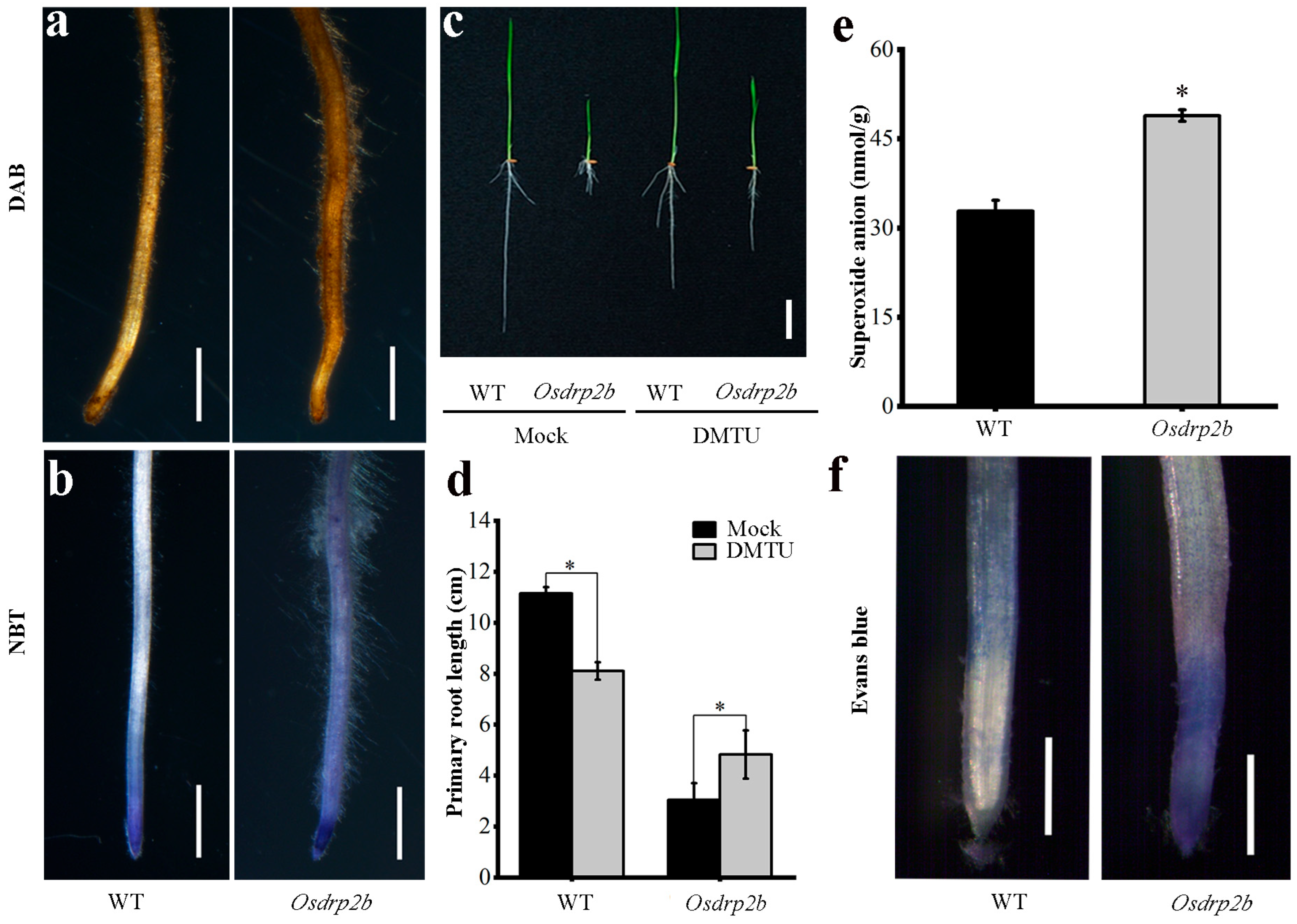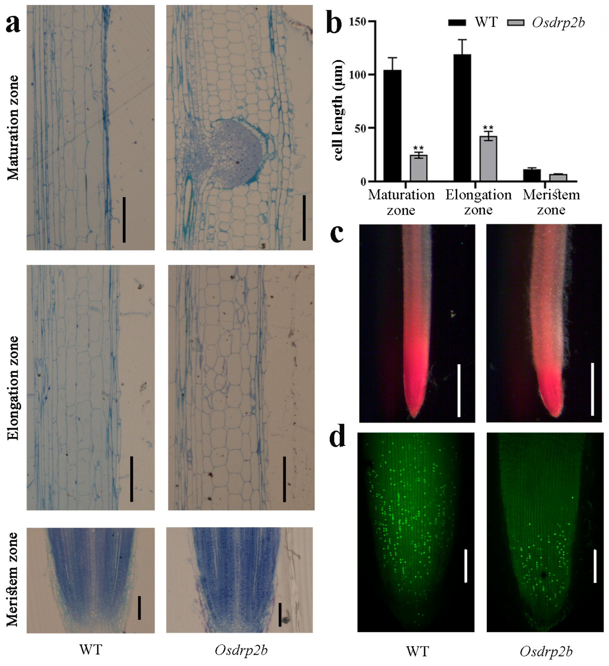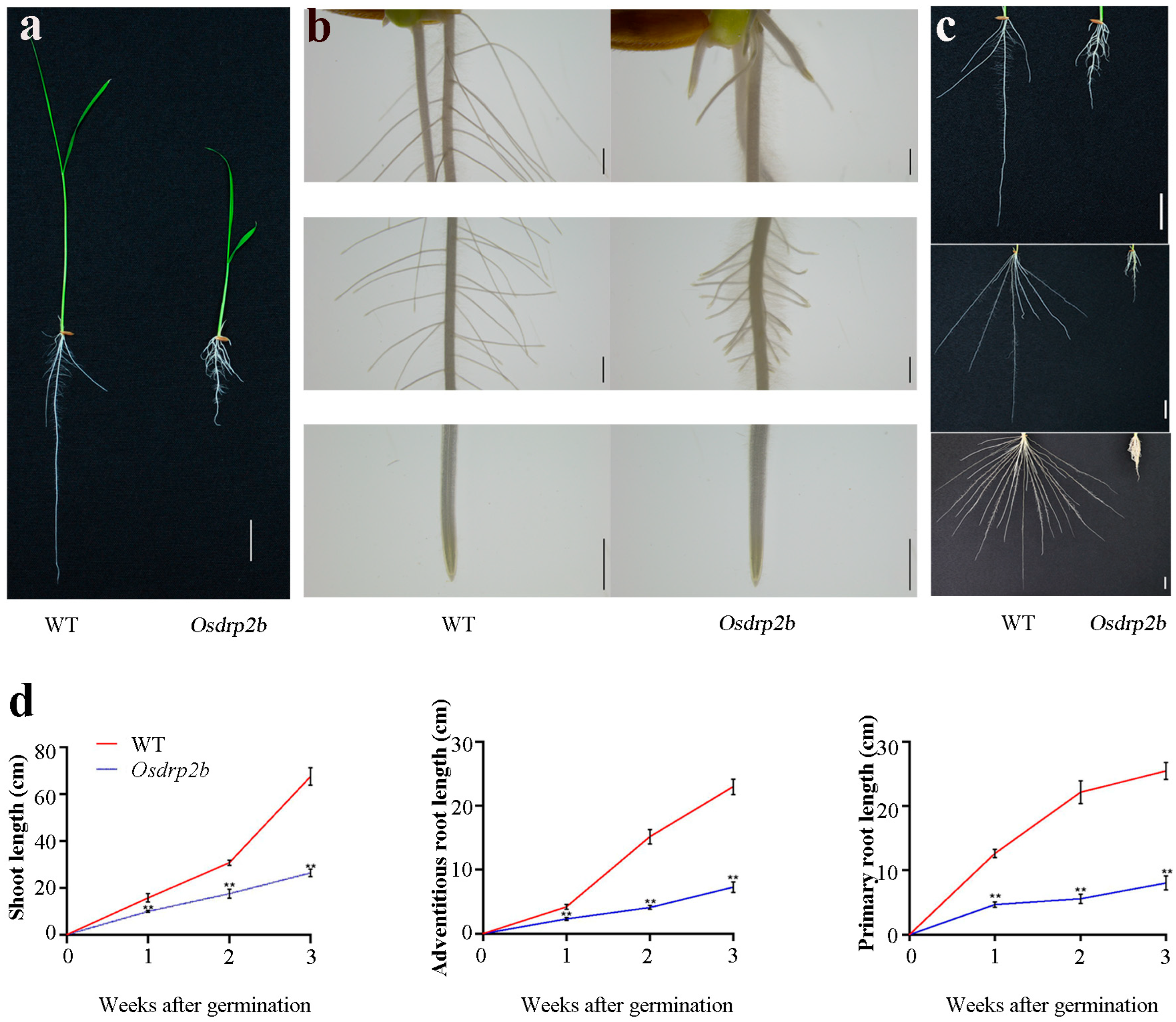 2.1. Characterization of Root Growth Defects in the Osdrp2b Mutant