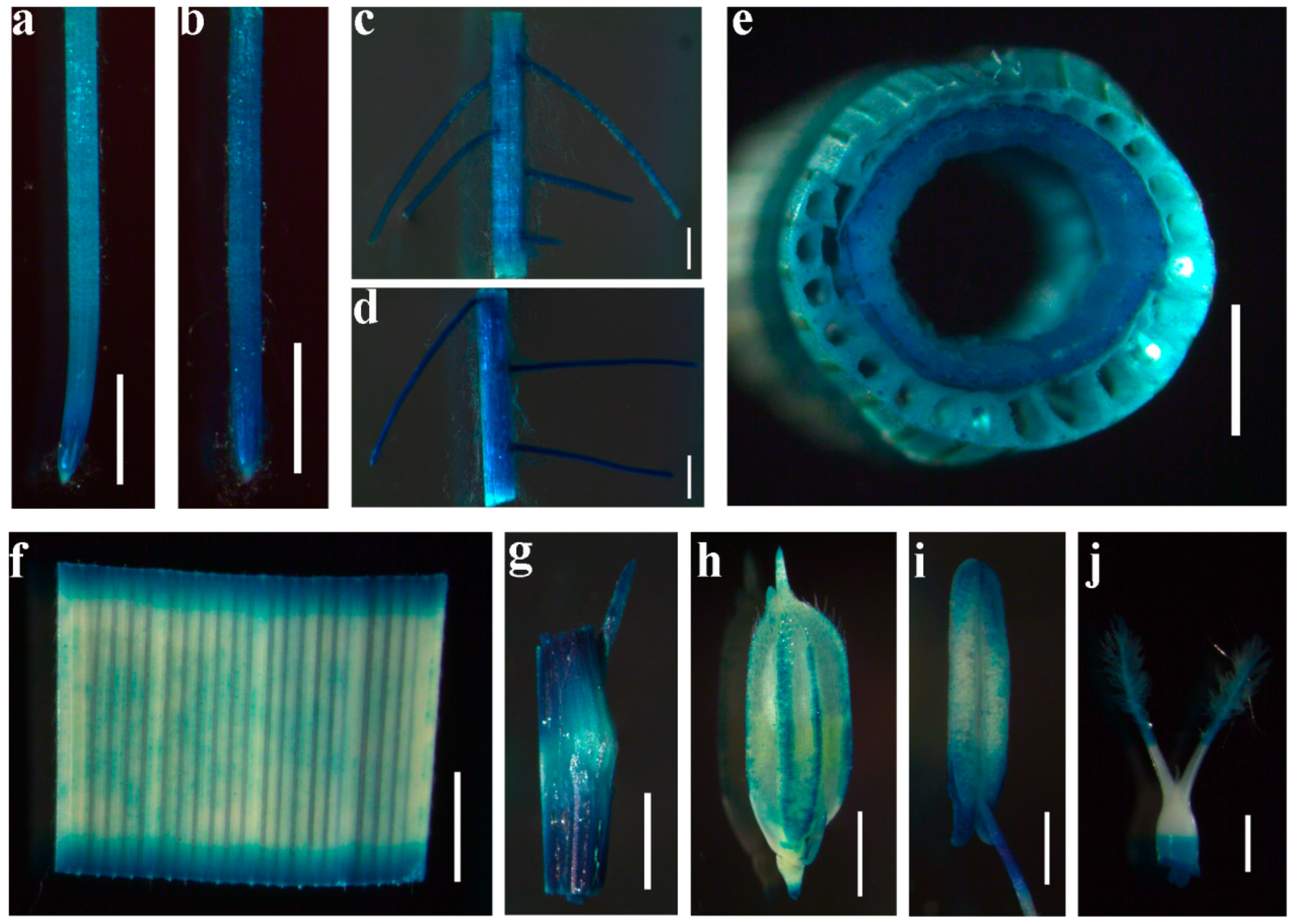 4.4. Histochemical Analysis and GUS Assay