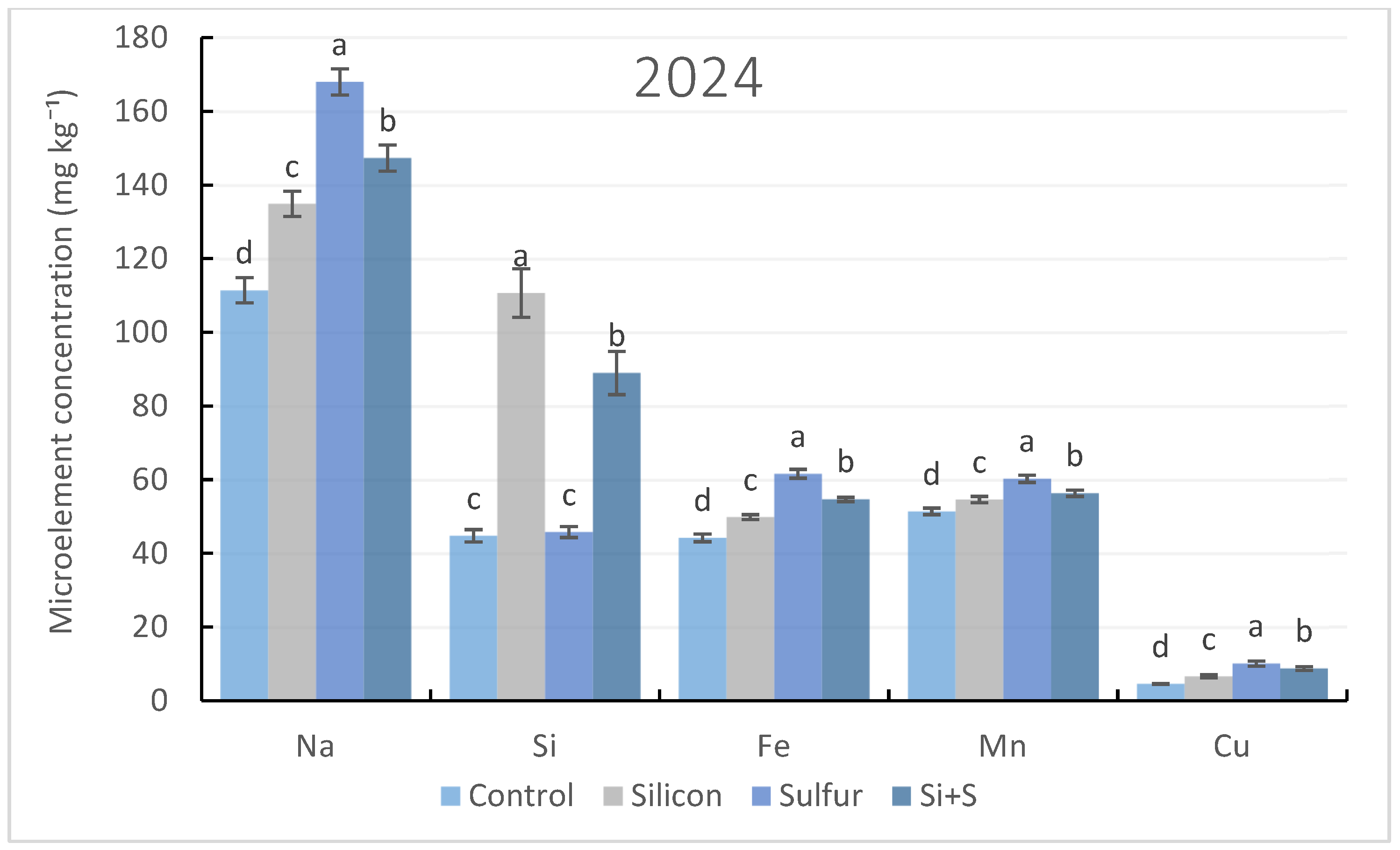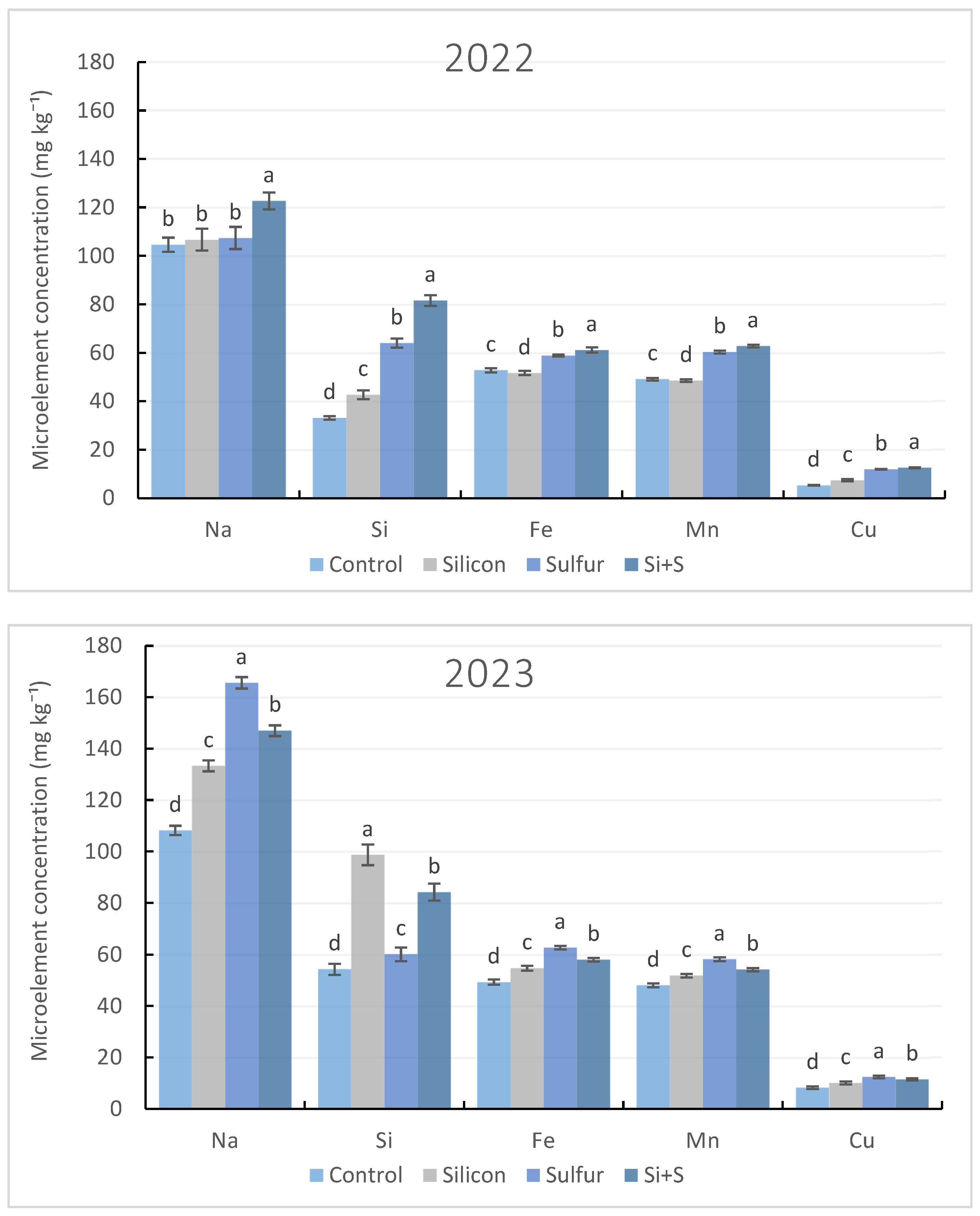 2.3.1. Effects of Silicon and Sulfur Foliar Treatments and Environment on Microelement Concentrations in Spring Oat Grain