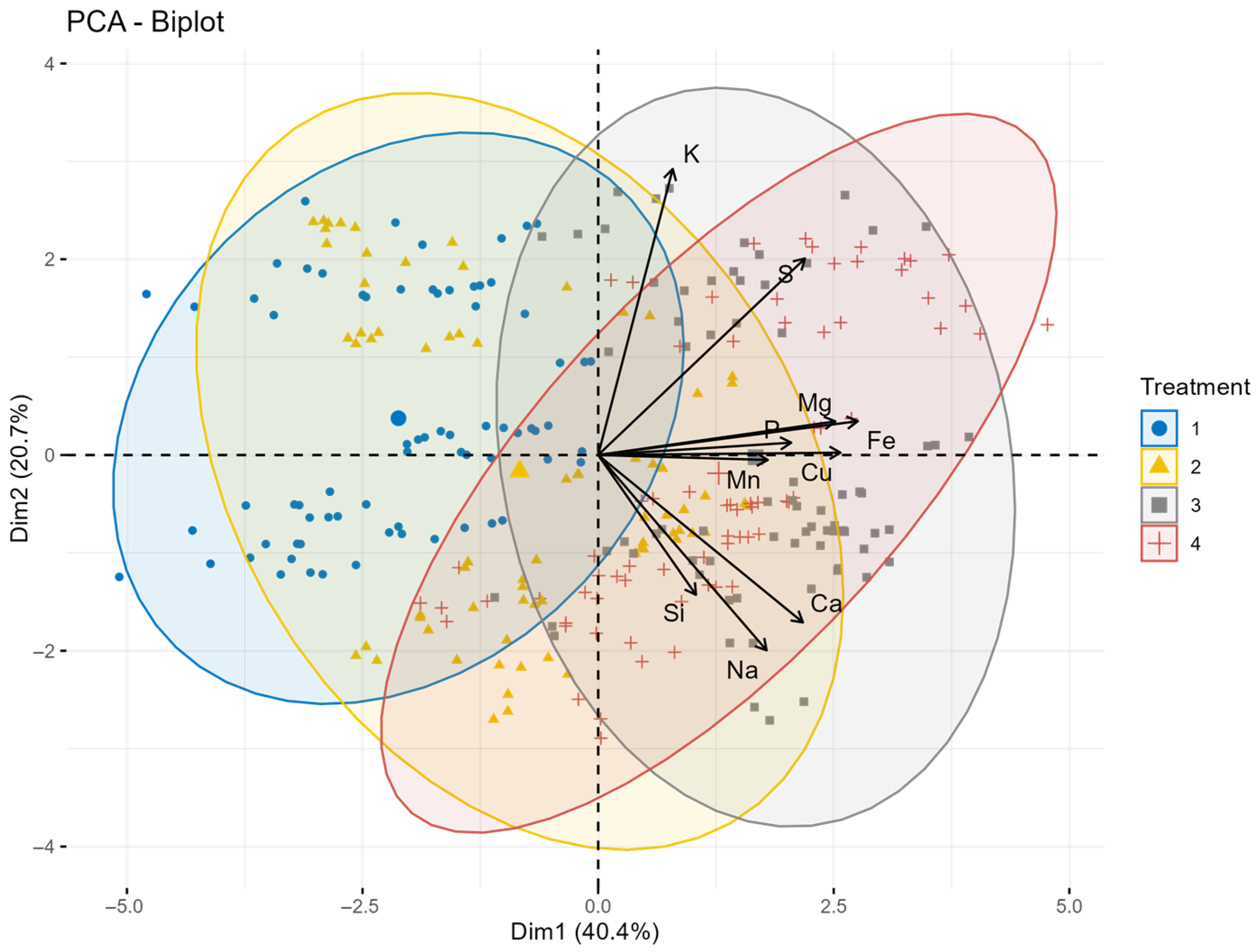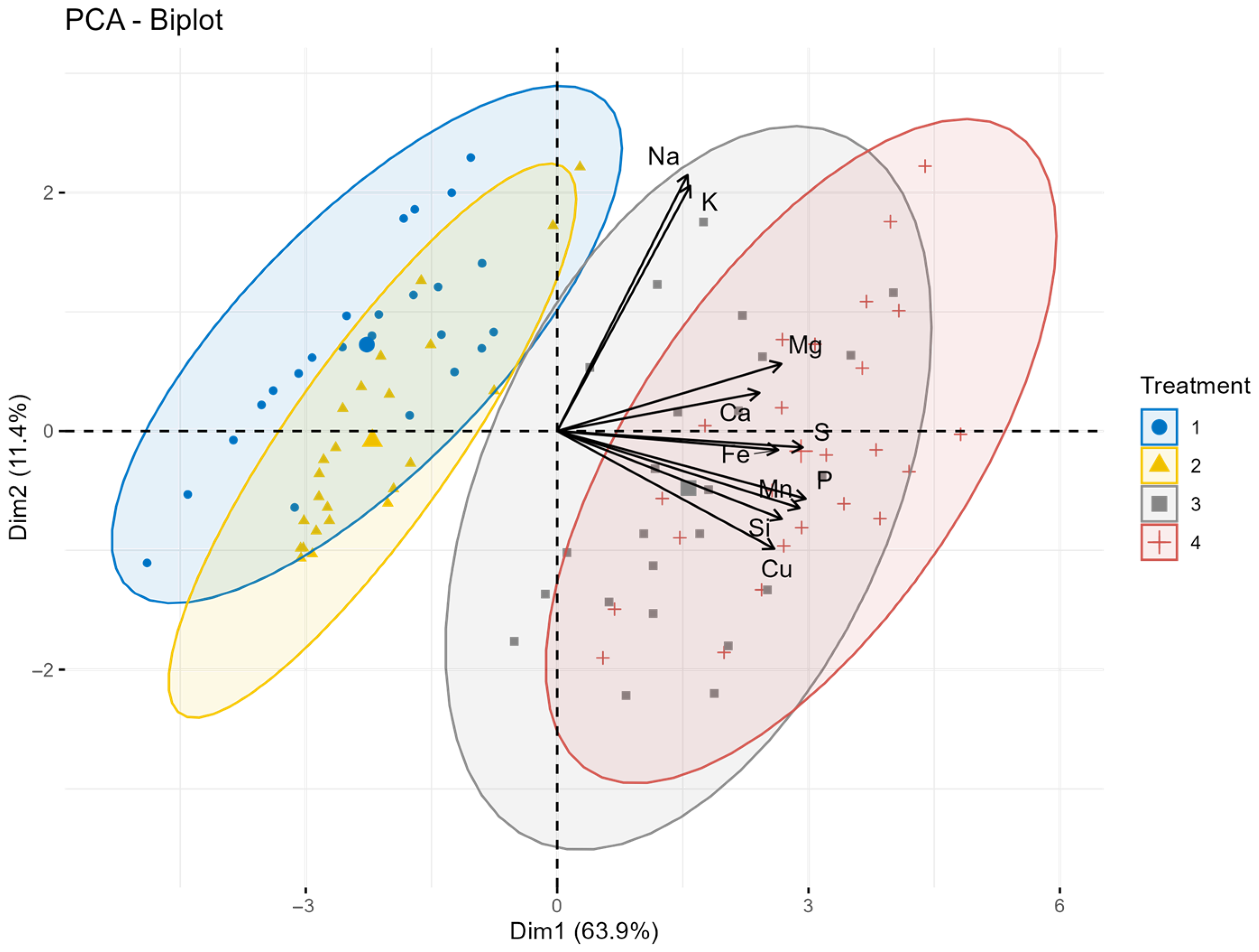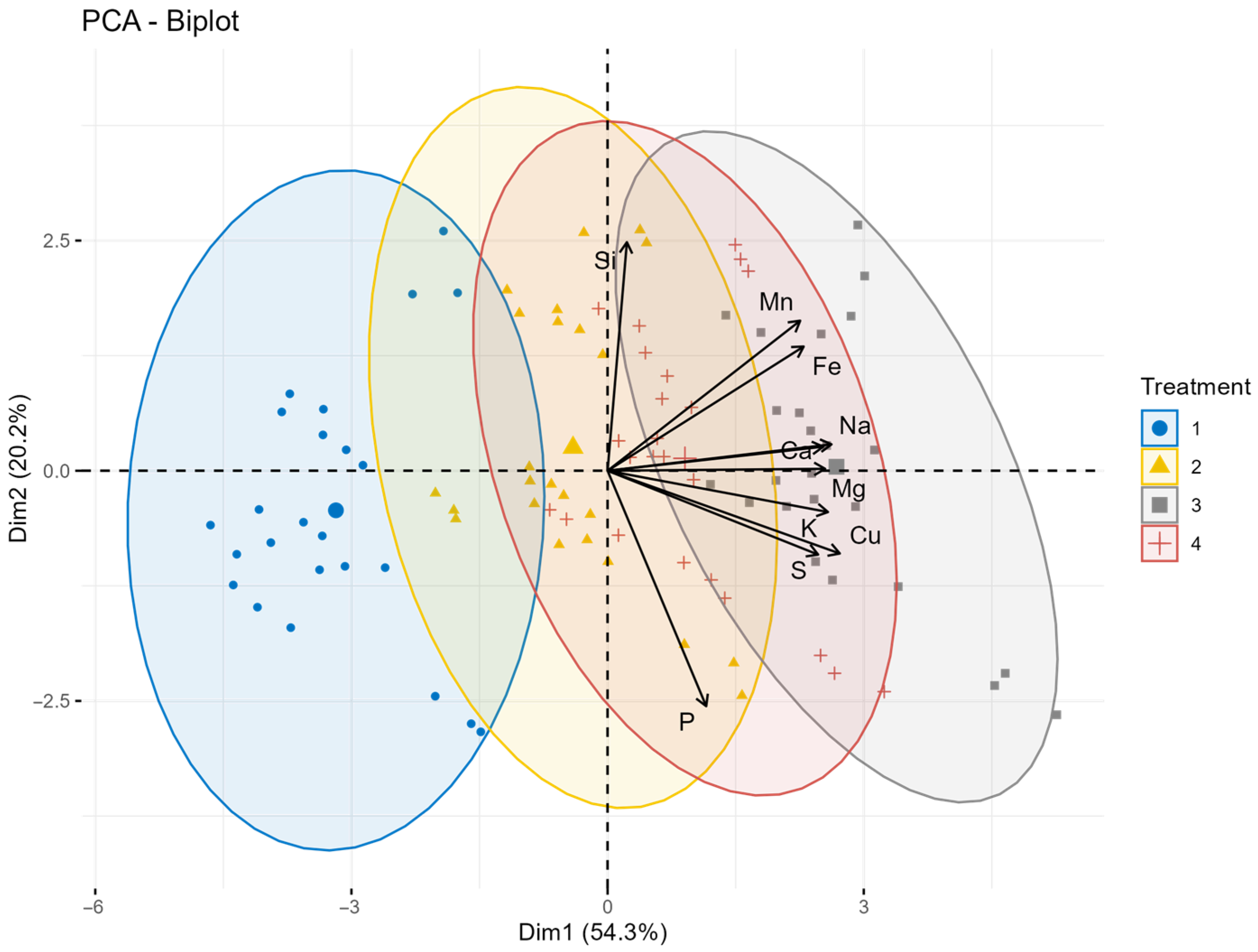2.7. Principal Component Analysis Results of Silicon and Sulfur Treatments on Macro- and Microelement Contents of Spring Oat Grains
