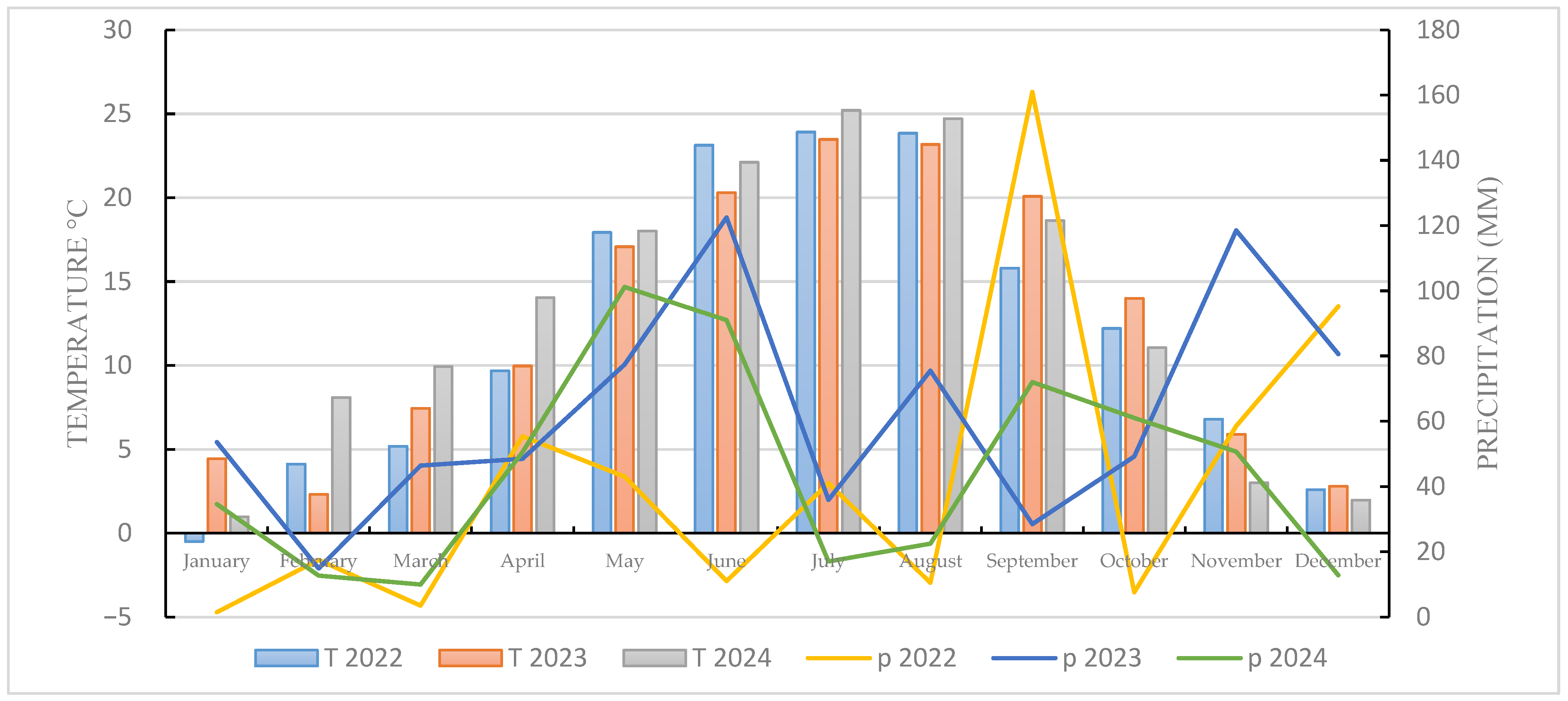 2.1. Assessment of Drought Severity in the Experimental Years Using the Pálfai Drought Index (PaDI)