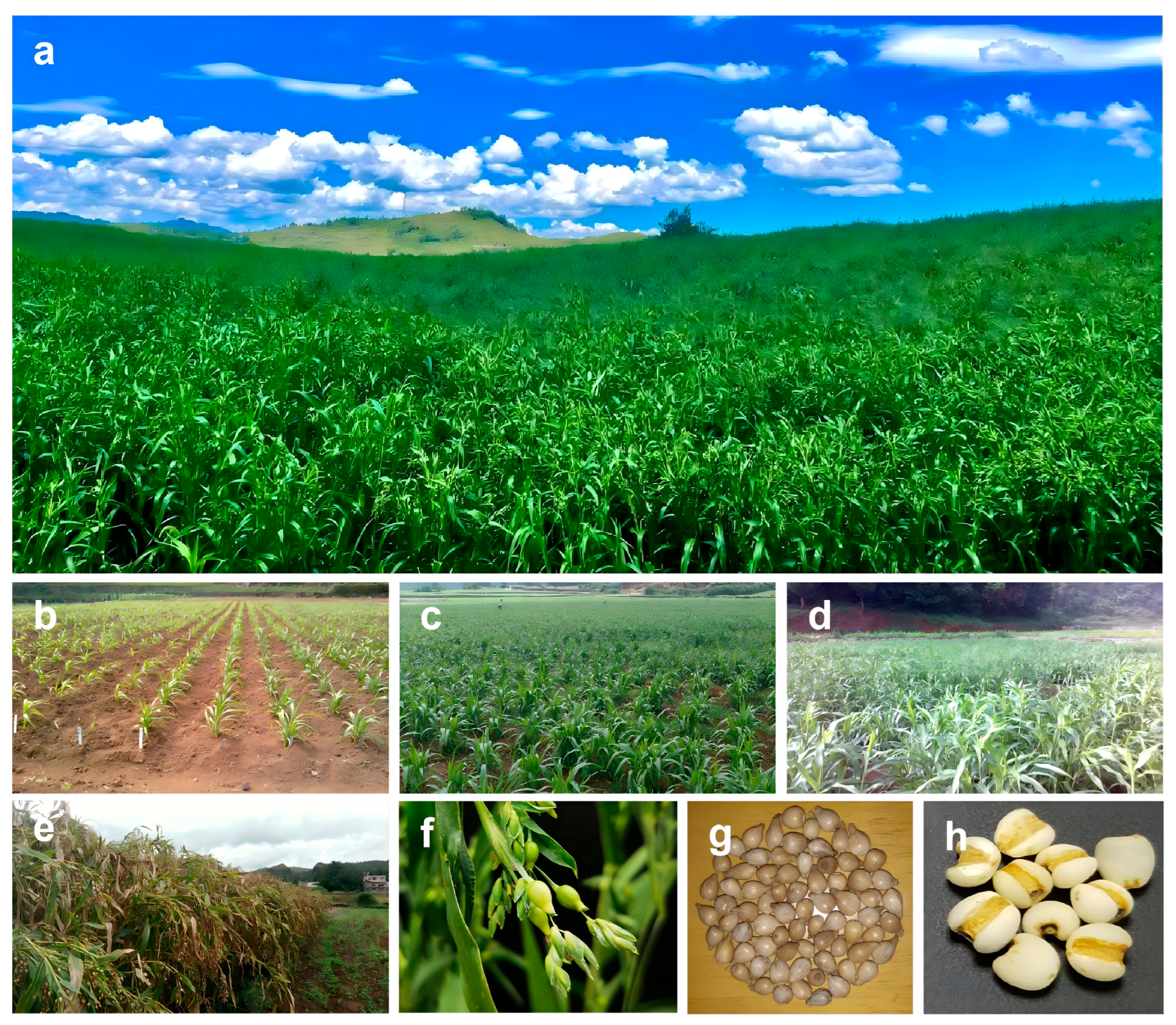 - Liu, H.; Shi, J.; Cai, Z.; Huang, Y.; Lv, M.; Du, H.; Gao, Q.; Zuo, Y.; Dong, Z.; Huang, W.; et al. Evolution and Domestication Footprints Uncovered from the Genomes of Coix. Mol. Plant 2020, 13, 295–308. [Google Scholar] [CrossRef] [PubMed]