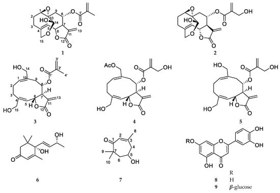 Five sesquiterpenes, vernolide (1), 3′-hydroxyvernolide (2), pectorolide (3), 4′-hydroxypectorolide-14-O-acetate (4), and 4′-hydroxypectorolide (5) were isolated from the aerial parts of V. migeodii, along with megastigmane (6S,9R)-vomifoliol (6), monoterpene eucarvone (7) and flavones luteolin (8) and luteolin-7-O-glucoside (9) (Figure 1). All compounds were described for the first time from this species. The sesquiterpenes are based on germacranolide skeleton, esterified with methacrylic (1, 3), hydroxymethacrylic (2, 4, 5) and acetic acids (4). Vernolide (1) and 3′-hydroxyvernolide (2) contain an 1,10-epoxy group and an unusual oxygen bridge between C-14 and C-15. The structure of the compounds was elucidated using 1D (1H NMR and 13C NMR JMOD) and 2D NMR (1H-1H COSY, NOESY, HSQC, HMBC) measurements. NMR data were in good agreement with those published for vernolide (1) [22], pectorolide (3) [23], 4′-hydroxypectorolide-14-O-acetate (4) [24], 4′-hydroxypectorolide (5) [25], (6S,9R)-vomifoliol (6) [26], eucarvone (7) [27], luteolin (8) and luteolin-7-O-glucoside (9) [28]. Our two-dimensional NMR studies allowed assignment of NMR signals in solvents other than published for vernolide (1) and 4′-hydroxypectorolide (5), and determination of unpublished NMR data for 3′-hydroxyvernolide (2), pectorolide (3), and eucarvone (7) (Tables S1 and S2).